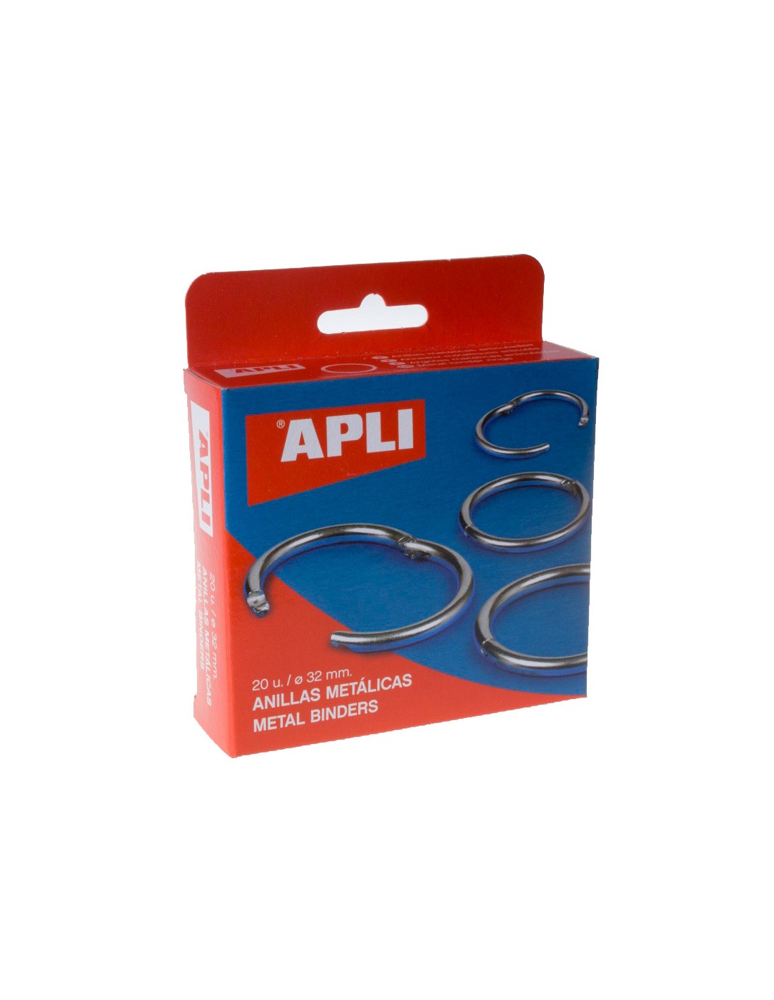 Anillas metálicas articuladas de 32 mm. Acabado niquelado para una mayor duración y resistencia. Ideales para encuadernación de hojas sueltas, archivo de notas, trabajos de scrapbooking, álbumes, llaveros, etc. Cada caja contiene 20 anillas. Características: -Medidas del producto: 32 mm -Color: Plata -Acabado: Metalizado -Formato de venta: Caja con eurohole