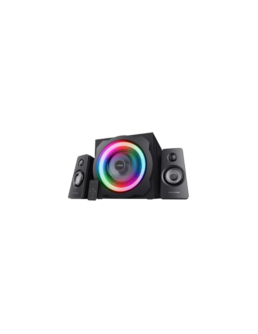 GXT 629 TYTAN es un potente juego de altavoces 2.1 con iluminacion regulable RGB LED y mando a distancia inalambrico. Caracteristicas: -Sonidos llenos de color Una abrumadora potencia de graves, sonido de alta calidad y un impresionante dise o adaptado al mundo del gaming, todo ello combinado en uno: el juego de altavoces GXT 629 Tytan 2.1 RGB cambiara la manera de experimentar el sonido. Ya sea jugando a los juegos mas recientes, escuchando musica o viendo peliculas, se puede disfrutar al maximo de todos los sonidos disponibles. Este altavoz no solo intensifica la reproduccion de sonidos potentes, sino que tambien es una explosion de color. La dinamica iluminacion RGB con LED del subwoofer, combinada con los altavoces satelite de color negro mate hace juego con cualquier configuracion para gaming. Se puede elegir entre 7 colores puros sincronizados con los graves (rojo, verde, azul, amarillo, purpura, azul claro y blanco). O puedes elegir una variacion de todos los colores, una asombrosa rotacion luminica o luces RGB sincronizadas con los graves: hay todo un mundo de posibilidades. -Un titan sonico Libera los atronadores sonidos del gaming con este juego de auriculares de 120 W de potencia maxima. Los altavoces satelite proporcionan una calidad de sonido excepcional en los tonos medios y altos. Esto, junto con el subwoofer de madera provisto de un altavoz de 7 pulgadas que aporta una gran profundidad a los sonidos del juego, asegura una experiencia de gaming total. -Control inalambrico Se puede controlar esta potente maquina sonica con el practico mando a distancia incluido. Ajusta y silencia facilmente el volumen, ajusta los graves y cambia las luces y enciende o apaga el altavoz con el clic de un boton. -Gestion inteligente de la energia El altavoz incorpora una gestion inteligente de la energia para ahorrar energia. El altavoz cambia automaticamente a modo en espera cuando no ha sido utilizado durante mas de 60 minutos. El altavoz se vuelve a encender automaticamente al reanudar el juego. Es mejor desactivar la gestion inteligente de la energia cuando se necesita una potencia maxima constantemente. Especificaciones: Desempe o: -Potencia estimada RMS: 60 W -Maxima energia: 120 W -Uso recomendado: Universal -Color del producto: Negro -Operado remotamente: Si -Tipo de control remoto: Inalambrico -Control de volumen: Digital -Canales de salida de audio: 2.1 canales Altavoces satelite: -Numero de satelites: 2 -Potencia RMS de altavoces satelite: 10 W -Rango de frecuencias de altavoz satelite: 20 - 20000 Hz -Impedancia de altavoz satelite: 4 ohms Subwoofer: -Potencia RMS de subwoofer: 30 W -Ajuste de bajos: Si Control de energia -Fuente de energia: Corriente alterna -Voltaje de entrada AC: 100 - 240 V -Consumo energetico: 240 W Peso y dimensiones: -Peso: 4,24 kg Contenido del embalaje: -Manual de usuario: Si -Mando a distancia incluido: Si Puertos e Interfaces: -Tecnologia de conectividad: Alambrico -Bluetooth: No -Microfono, jack de entrada: No -Entrada de linea: Si -Conectividad en linea de entrada: 3.5 mm