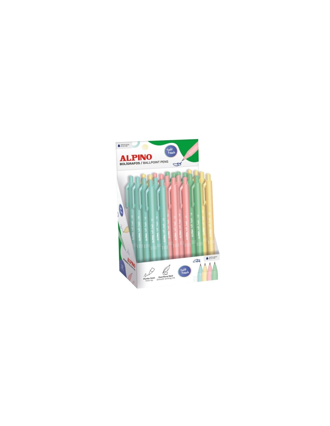Alpino Soft Touch Pastel Expositor con 24 Boligrafos Retractiles - Punta 1mm - Tacto Suave - Tinta Azul - Colores Pastel