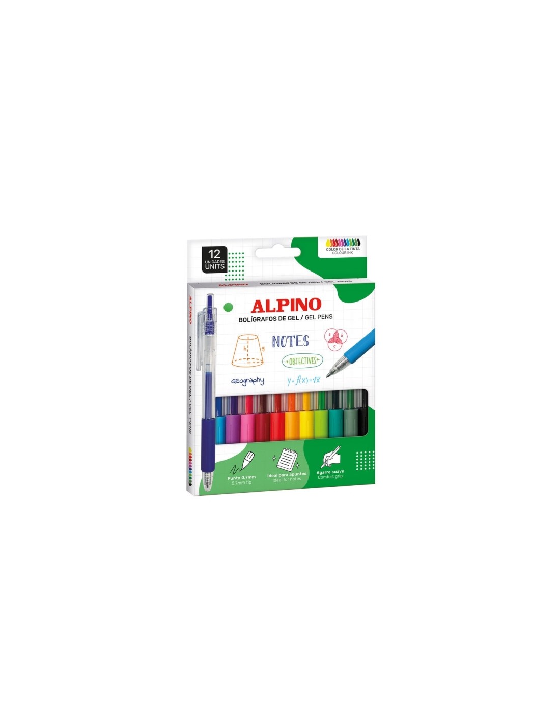 Pack con 12 bol grafos multicolor Alpino Line Gel. Su tinta en gel de alta calidad proporciona un trazo intenso y uniforme, perfecto para escritura creativa, subrayado o decoraci n de apuntes. Caracter sticas: -Gracias a su f rmula de gel de alta calidad, estos bol grafos garantizan una escritura fluida y sin esfuerzo. Su tinta se desliza con suavidad sobre el papel, proporcionando un resultado n tido, uniforme y sin interrupciones. -La punta de 0.7 mm ofrece un equilibrio ideal entre grosor y precisi n, asegurando un trazo detallado y claro. Perfecto tanto para escritura r pida y eficiente como para tareas creativas y art sticas. -Con un mecanismo retr ctil, estos bol grafos permiten un uso pr ctico y seguro, evitando manchas accidentales y protegiendo la punta cuando no se utilizan. Una opci n c moda y funcional para cualquier situaci n.