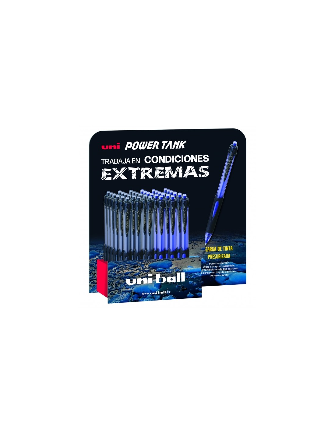 Uni Power Tank -SN-220/3D EXPOSITOR 1,0mm Características: -Punta de acero inoxidable -Bola de 1,0 mm. fabricada en carburo de tungsteno -Carga presurizada a 3000hPa, que permite escribir sobre cualquier superfície y soporta temperaturas de hasta -20º C e incluso debajo del agua -Tinta de base agua pigmentada