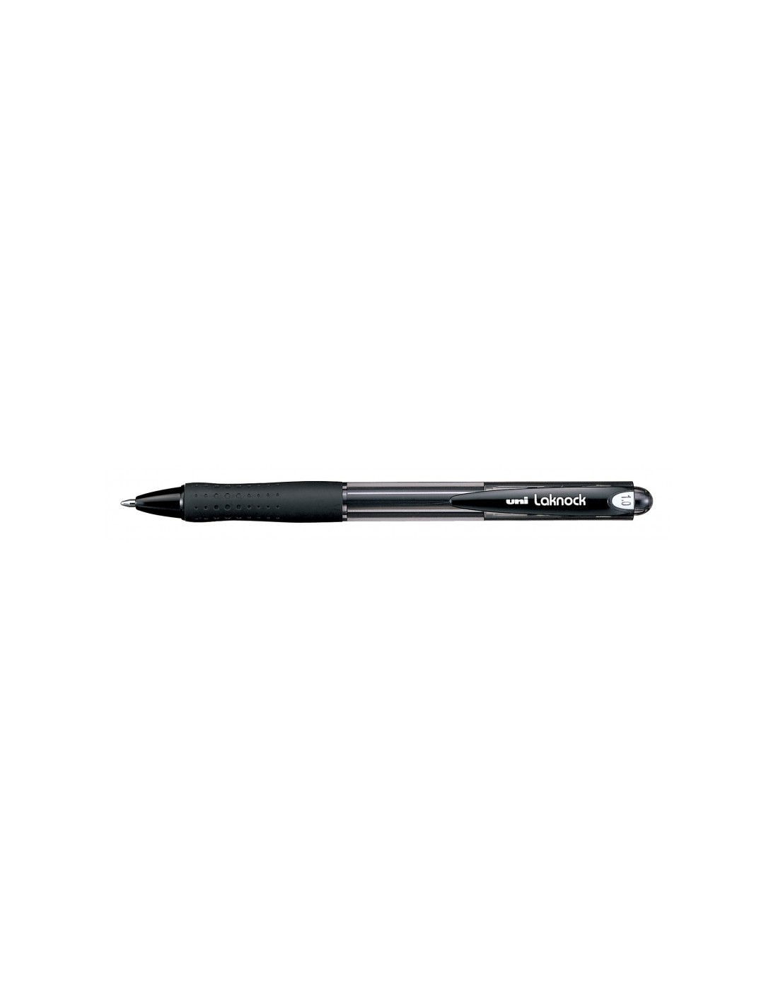 Uni Laknock -SN-100(10) Negro 1,0mm Características: -Punta de acero inoxidable -Bola de 1,0 mm de carburo de tungsteno y cuerpo de plástico código de color en clip y zona de sujeción -Tinta base aceite -Un nuevo concepto de bolígrafo, su tinta contiene nuevos componentes que ofrecen una suavidad única en el mercado -La capacidad de carga de tinta es muy superior a la habitual consiguiendo así la máxima relación calidad-precio