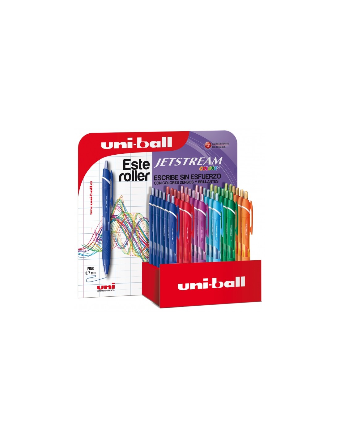 Uni JetStream Sport Colores -SXN-150C/3D EXPOSITOR 0,7mm Características: -Punta de acero inoxidable -Bola de 0,7 mm fabricada en carburo de tungsteno -Cuerpo y clip de plástico -Retráctil -Tinta pigmentada de gran resistencia al agua y a la luz, que hace que la escritura sea tan cómoda que el escribir se convierta en todo un placer -Secado instantáneo. Ideal para zurdos