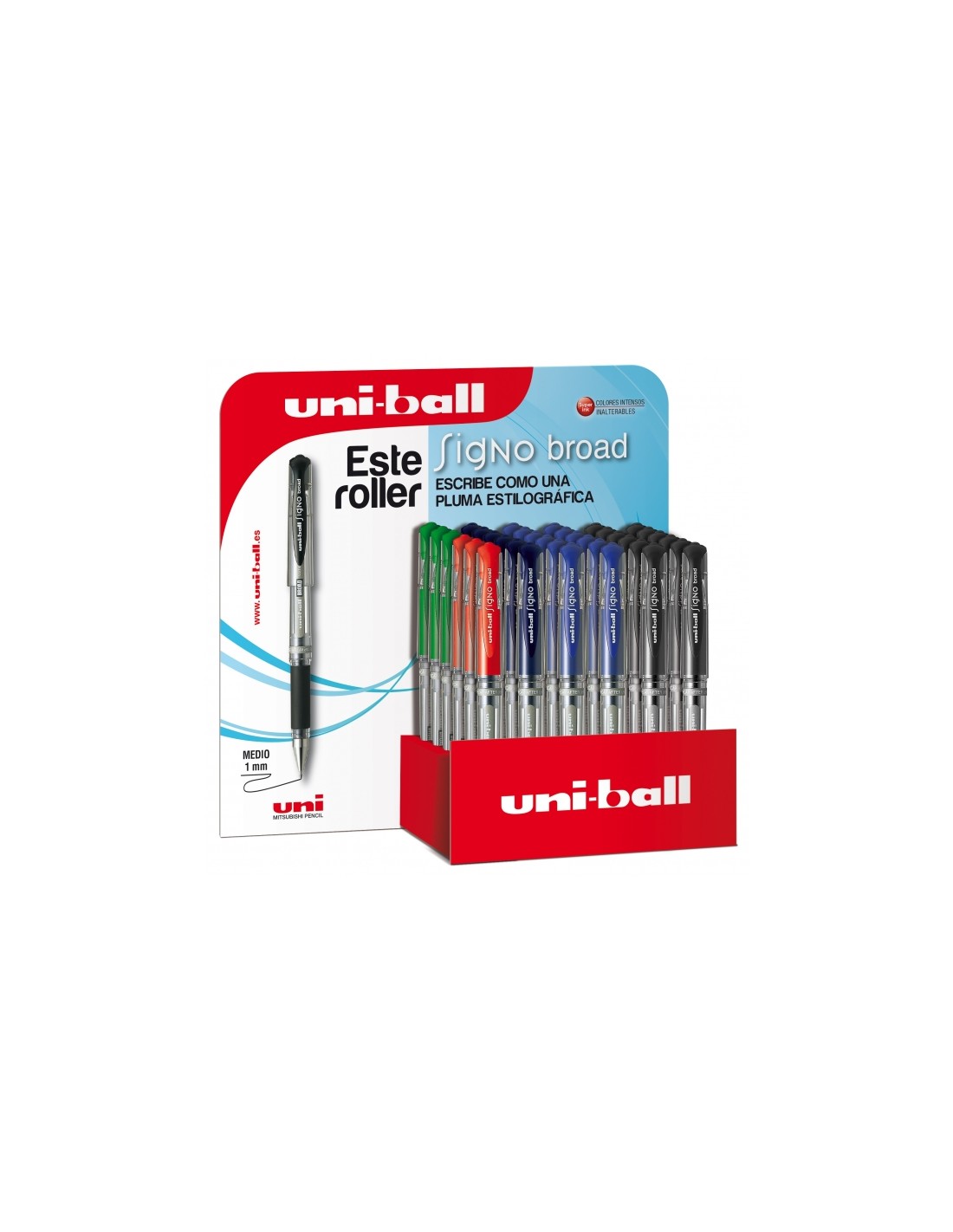 Uni-ball Signo Broad -UM-153/3D EXPOSITOR 1,0mm Características: -Punta de acero inoxidable -Bola de 1,0 mm de carburo de tungsteno -Cuerpo de plástico -Código color en clip y zona de sujeción -Este roller de tinta gel es único, su trazo es diferente y da la sensación de escribir con pluma estilográfica, ideal para dar un toque personal a tu escritura. El acabado es de lujo con sujeción de caucho protegida -La tinta tiene una duración de 5 años
