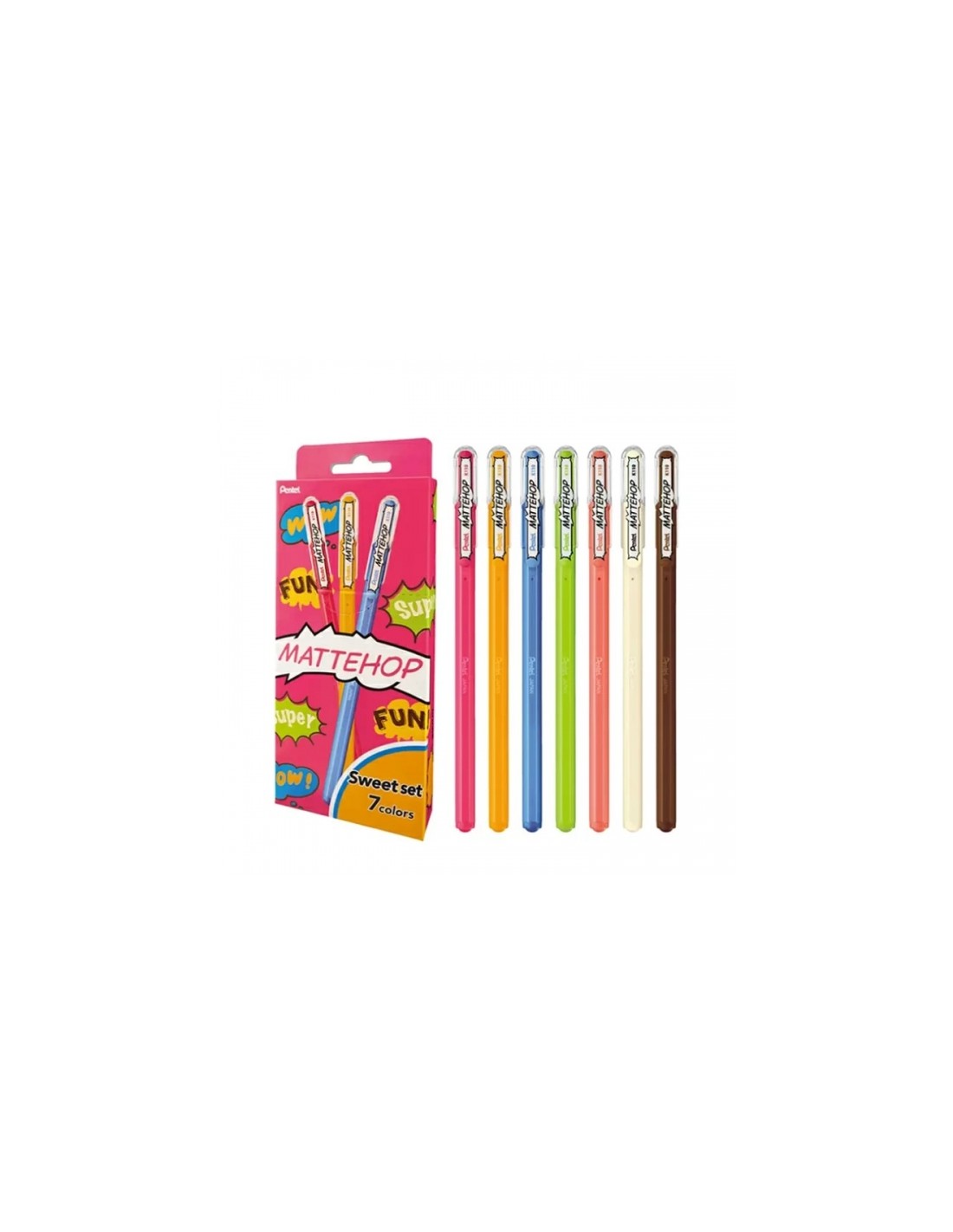Pentel Mattehop Sweet Pack de 7 Boligrafos de Bola Un nuevo tipo de tinta con altísimo poder de cobertura y acabado mate permite una escritura ligera, suave y agradable. Perfecto para papel oscuro, coloreado y claro. Recomendado para dibujar, colorear y tomar notas. También es adecuado para dibujar sobre papeles fotográficos, lisos y kraft. Destaca el efecto de los dibujos animados y las ilustraciones estilo cómic. Para lograr el mejor efecto, presione la punta muy suavemente contra la superficie. Caracteristicas: -Tinta resistente al agua y a la luz -Punta de bola de 1 mm -Tinta de Gel Opaca -Cuerpo y clip del color de la escritura. -Colores: Surtidos -Pack de 7uds.