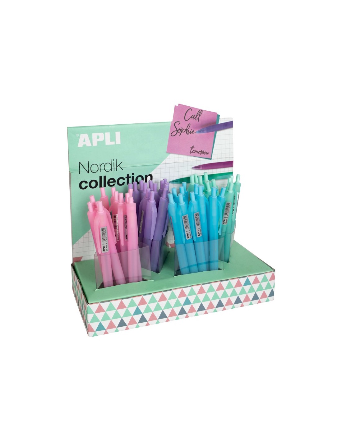 Expositor de bolígrafos con tinta de gel de la gama Nordik Collection en colores pastel: rosa, lila, azul y verde. Cada expositor contiene 48 unidades, 12 unidades por color. Los bolígrafos tienen una punta de 0,5 mm y un acabado soft touch en silicona, suave y agradable al tacto. Escritura en tinta de gel de color azul. Características: -Color de cuerpo: Azul turquesa, Malva, Rosa, Verde esmeralda -Formato de venta: Expositor