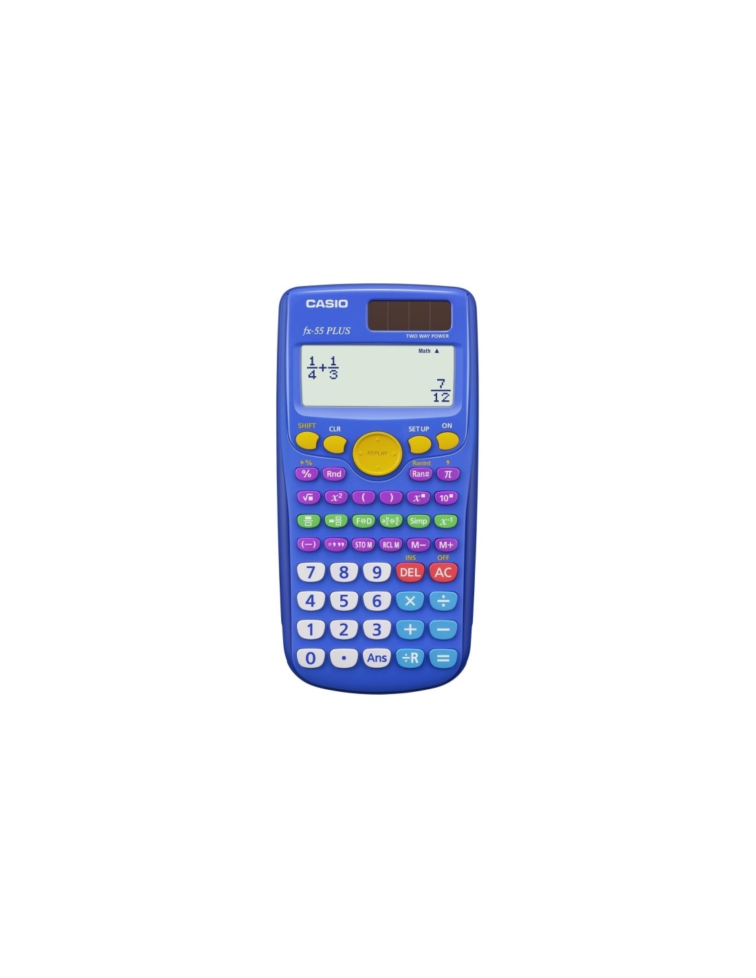 La calculadora ideal para primaria. Con las funciones agrupadas por colores y una pantalla grande, la fx-55 PLUS es el mejor aliado para el desarrollo matemático en primaria. Especificaciones: Características de las funciones: -Escritura matemática natural -Cálculo de división con resto -Cálculos básicos -Porcentajes -Cálculos con grados, minutos y segundos -Historial de operaciones -Memoria de respuesta (Ans) -Memoria independiente (M) -Paréntesis -Simplificación manual de funciones -Mensaje de aviso en errores de cálculo. P. ej. (14/0) General: -Pantalla de 4 líneas -Alimentación: Celda solar pila 1 x LR44 -Dimensiones (Al x An x Pr): 163 x 80 x 11,1 mm -Peso aproximado: 95g con pila incluida
