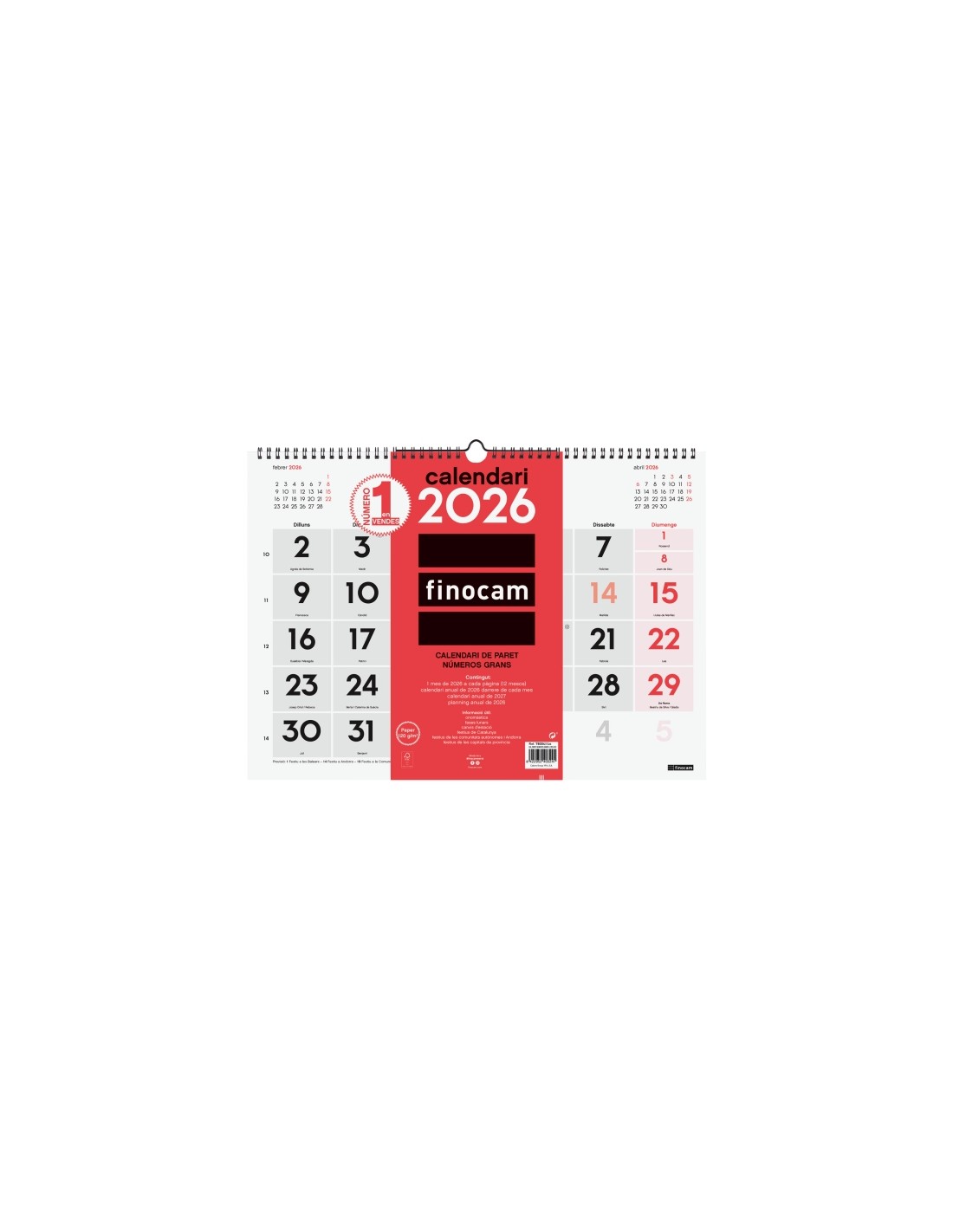 Finocam Calendario de Pared en Catalan - Anual 2026 - 430x5x320mm - Numeros Grandes - Color Blanco y Rojo
