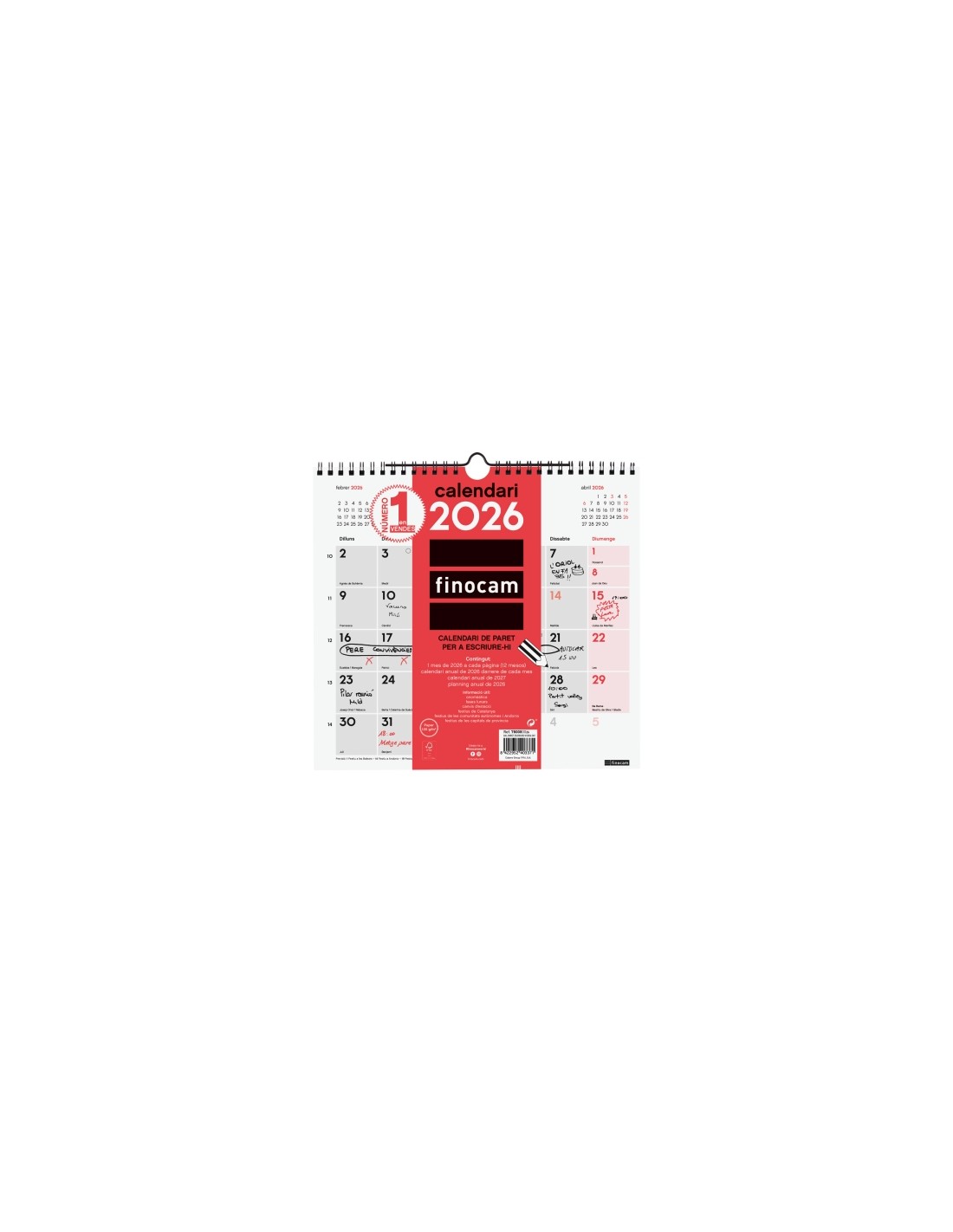 Calendario anual de pared encuadernado con espiral doble y con colgador. Perfecto para planificar. Contiene informaci n ºtil y de inter s, espacio diario para anotaciones y mes anterior y posterior en cada p gina. Ideal para la coordinaci n de equipos en salas de reuniones o para el hogar. Caracter sticas: -Periodo: Enero 2026 -Diciembre 2026 (12 meses) -Contenido: La anualidad del calendario incluye la informaci n relativa a: festivos internacionales, fases lunares y cambios de estaci n. El calendario dispone de contenidos extra: calendarios reducidos de septiembre a diciembre del a o anterior, planning anual, plantilla de horario, calendario anual del a o y del a o siguiente, listado de festivos internacionales y c digos de pa ses. -Caracter sticas destacables: Los art culos Finocam est n dise ados para optimizar tu organizaci n personal, haciendo tu vida m s pr ctica, c moda y a la vez m s bella. -Duraci n agenda/calendario: 12 meses (enero-diciembre) -Materiales principales: Papel y espiral doble met lica. -Gramaje del papel: 120g/m -Papel: Papel FSC ecol gico libre de cloro elemental y de cido, fabricado mediante la utilizaci n de energ as limpias, con el 100 de celulosa controlada, y bajo los certificados de calidad ISO9001:2015 y medio ambiente ISO14001:2015, cumpliendo as la normativa ISO9706 sobre la permanencia del papel. El Forest Stewardship Council (FSC ) es una organizaci n no gubernamental, independiente, sin nimo de lucro, establecida para promover una gesti n forestal ambientalmente responsable, socialmente beneficiosa y econ micamente viable en los bosques de todo el mundo. -Peso: 145g -Medidas exteriores: 265x5x255mm