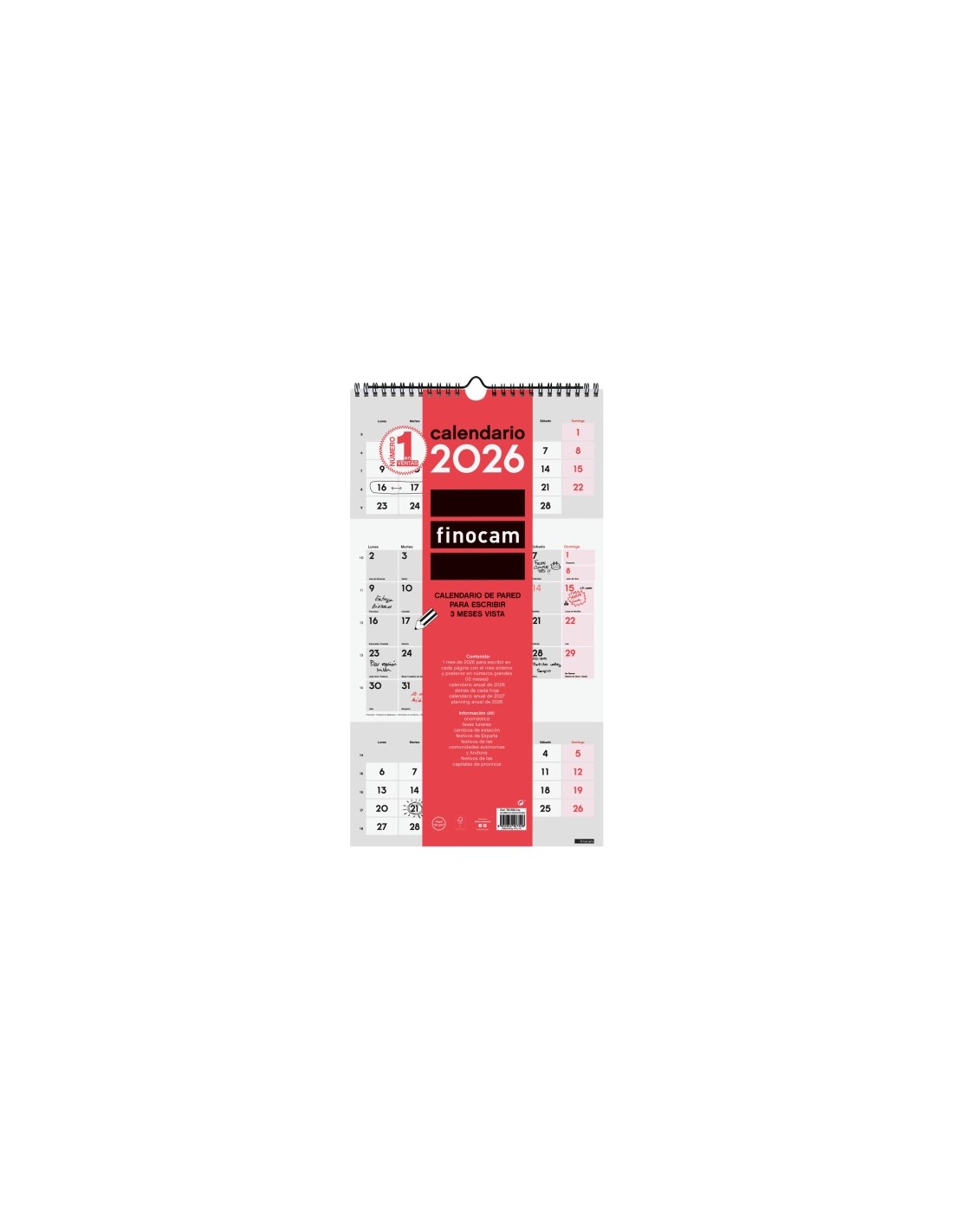Finocam Calendario de Pared - Anual 2026 - Espacio para Escribir - 236x8x440mm - 3 Meses Vista - Color Blanco y Rojo
