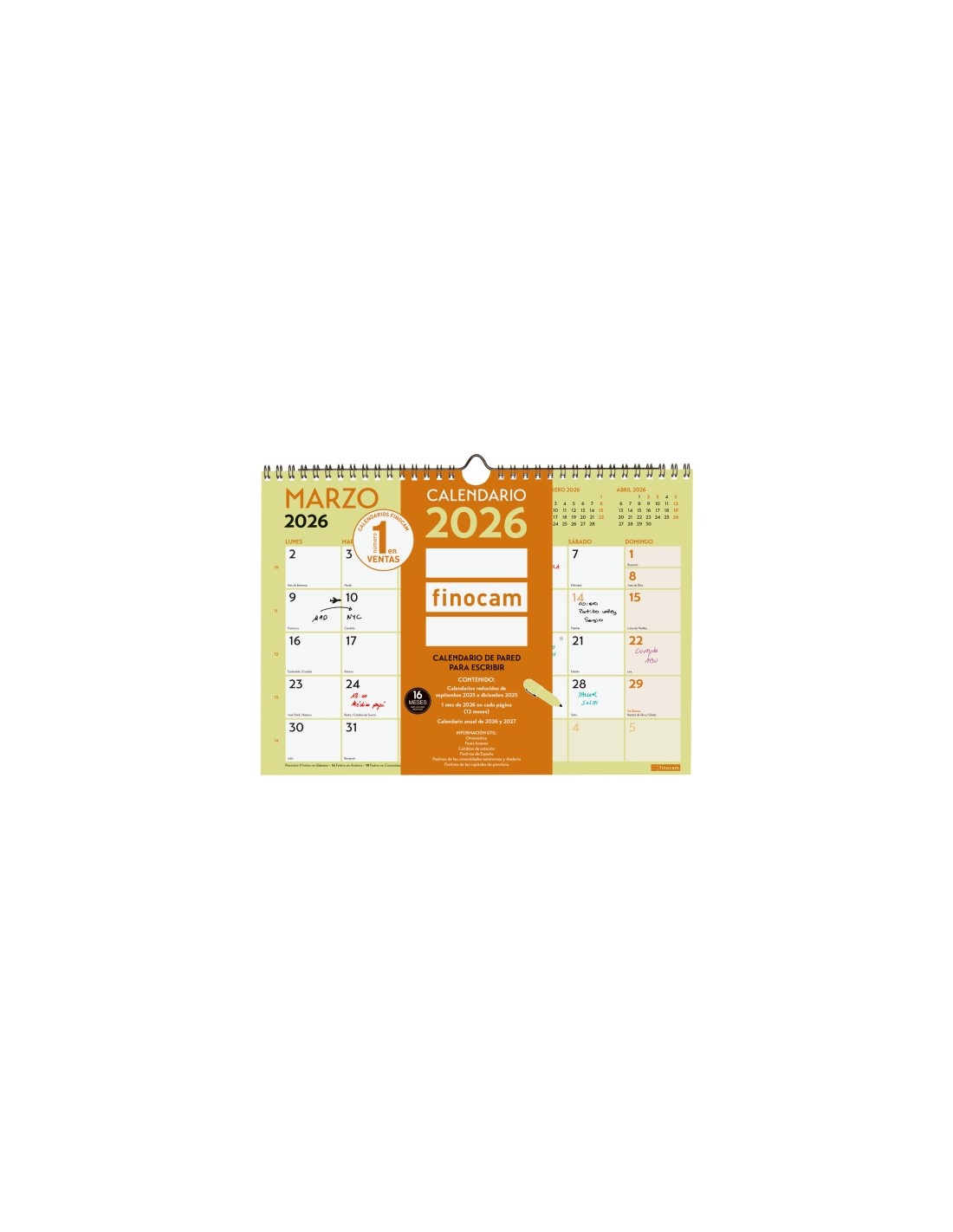 Calendario de Pared para Escribir 2026 de la marca Finocam, dise ado para organizar el a o con informaci n sobre festivos, fases lunares y otros datos ºtiles. Incluye 12 meses principales y meses reducidos del a o anterior, elaborado en papel ecol gico y con materiales de calidad. Caracter sticas: -Periodo: Enero 2026 -Diciembre 2026 (12 meses) Sep.-Dic. 2025 (4 meses) reducidos -Contenido: La anualidad del calendario incluye la informaci n relativa a: onom stica, festivos nacionales, festivos de las CC. AA., d as se alados, fases lunares y cambios de estaci n. Detr s de la hoja de cada mes se puede consultar el calendario anual. El calendario dispone tambi n de otros contenidos extra: calendarios reducidos de septiembre a diciembre del a o anterior, calendario anual del a o y del a o siguiente, planning anual, listado de festivos de las CC. AA. y de las capitales de provincia e inicios de los a os nuevos chino, musulm n, ortodoxo y hebreo. -Caracter sticas destacables: Los art culos Finocam est n dise ados para optimizar tu organizaci n personal, haciendo tu vida m s pr ctica, c moda y a la vez m s bella. -Duraci n agenda/calendario: 12 meses (enero-diciembre) 4 meses reducidos del a o anterior -Materiales principales: Papel y espiral doble met lica. -Gramaje del papel: 120g/m -Papel: Papel FSC ecol gico libre de cloro elemental y de cido, fabricado mediante la utilizaci n de energ as limpias, con el 100 de celulosa controlada, y bajo los certificados de calidad ISO9001:2015 y medio ambiente ISO14001:2015, cumpliendo as la normativa ISO9706 sobre la permanencia del papel. El Forest Stewardship Council (FSC ) es una organizaci n no gubernamental, independiente, sin nimo de lucro, establecida para promover una gesti n forestal ambientalmente responsable, socialmente beneficiosa y econ micamente viable en los bosques de todo el mundo. -Peso: 150g -Medidas exteriores: 297x10x212mm