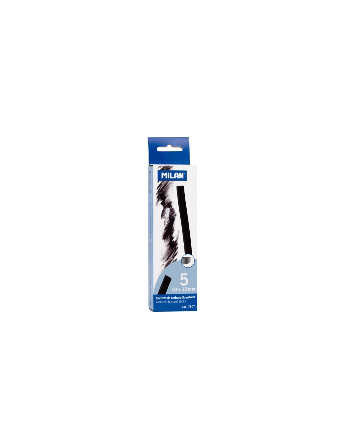 Caja con 5 barritas de carboncillo natural de la marca Milan. Caracter sticas: -Caja con 5 barritas -Forma c ºbica -10 x 10mm de lado -15cm de longitud -Material: madera de aliso quemada -Proceso: hervido, precalentado, quemado en horno -Textura: irregular -Color: gris ceo-negro -Uso: trazos oscuros, sombreado -Calidad: consistente, rendimiento ptimo