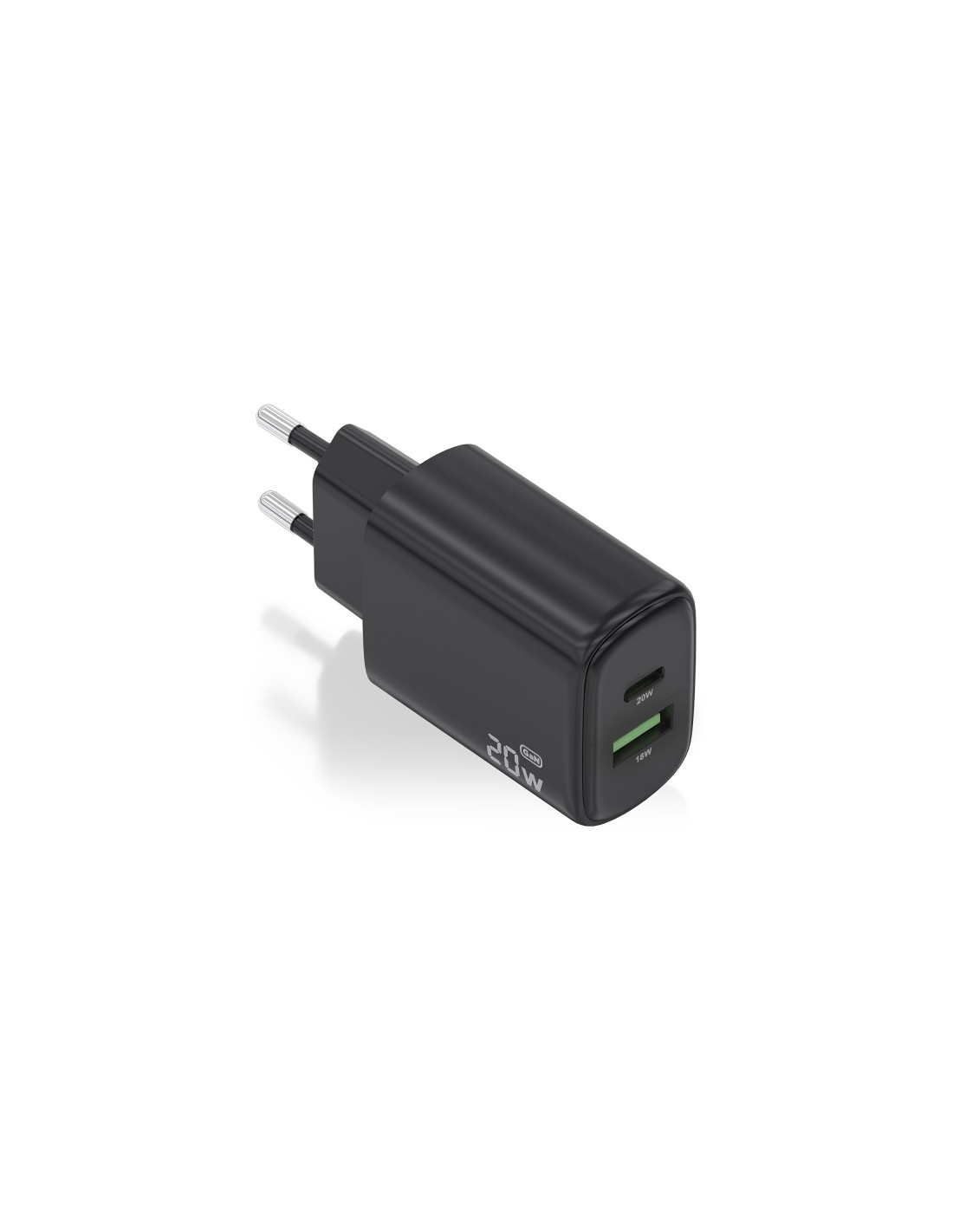 Cargador GaN USB-C 20W para cargar portátiles, móviles, cámaras y tablets etc. Diseño muy elegante, moderno y práctico. Este cargador cuenta F65on la tecnología GaN que ofrece una serie de ventajas, incluyendo una mayor eficiencia energética, menor generación de calor, mayor capacidad de corriente y menor tamaño y peso en comparación con los cargadores tradicionales de silicio. Estas ventajas hacen que los cargadores GaN sean una opción cada vez más popular para usuarios que buscan una carga más rápida, eficiente y sostenible. Tecnología AI (chip inteligente) incorporado que detecta el tipo de protocolo del dispositivo conectado para maximizar tanto la compatibilidad como la velocidad de carga. Cargue su dispositivo USB-C o USB-A de forma fácil y sencilla. Múltiples protecciones contra sobrecarga, cortocircuito, lo que garantiza la máxima seguridad para su dispositivo. Este cargador puede cargar simultáneamente 2 dispositivos USB-A y USB-C. Características: -Cantidad de puertos USB-C: 1 -Cantidad de puertos USB-A: 1 -Entrada: 100-240V 50-60Hz 0.6A -Salida USB-C: 5.0V 3.0A, 9.0V 2.22A, 12.0V 1.67A 20W PPS: 5-11V 1.8A (19.8W Max) -Salida USB-A QC3.0: 5.0V 3A, 9.0V 2.0A, 12V 1.5A 18W -Salida USB-C USB-A: 5.0V 3.0A 15W -Potencia: 20W -Nivel de eficiencia: VI -Compatible con la mayoria de los dispositivos USB-C o USB-A tales como portátiles, teléfonos móviles, smartphones, tablets, GPS, MP3, MP4, consolas de videojuego etc. -Soporta PD3.0 para poder cargar dispositivos inteligentes con tecnología PD3.0 de forma muy rápida. -Soporta QC3.0 para poder cargar dispositivos inteligentes con tecnología QC3.0 de forma muy rápida. -Aparte de soportar protocolo PD3.0 y QC3.0, este cargador también soporta los siguientes protocolos en su puerto USB-C y USB-A: QC3.0: 3.6V-11.83V QC2.0 / QC4.0: 5V, 9V, 12V HUAWEI FCP: 5V, 9V, 12V HUAWEI SCP: 5.5-10V SAMSUNG AFC: 9V, 12V APPLE: 5V 2.4A BC1.2: DCP 5V 1.5A -Está fabricado con material ignífugo e incluye múltiples protecciones contra sobrecarga, cortocircuito, lo que garantiza la máxima seguridad para su dispositivo. -Color: Negro -Normativas: RoHS, CE -Test de funcionamiento: 100 testeado