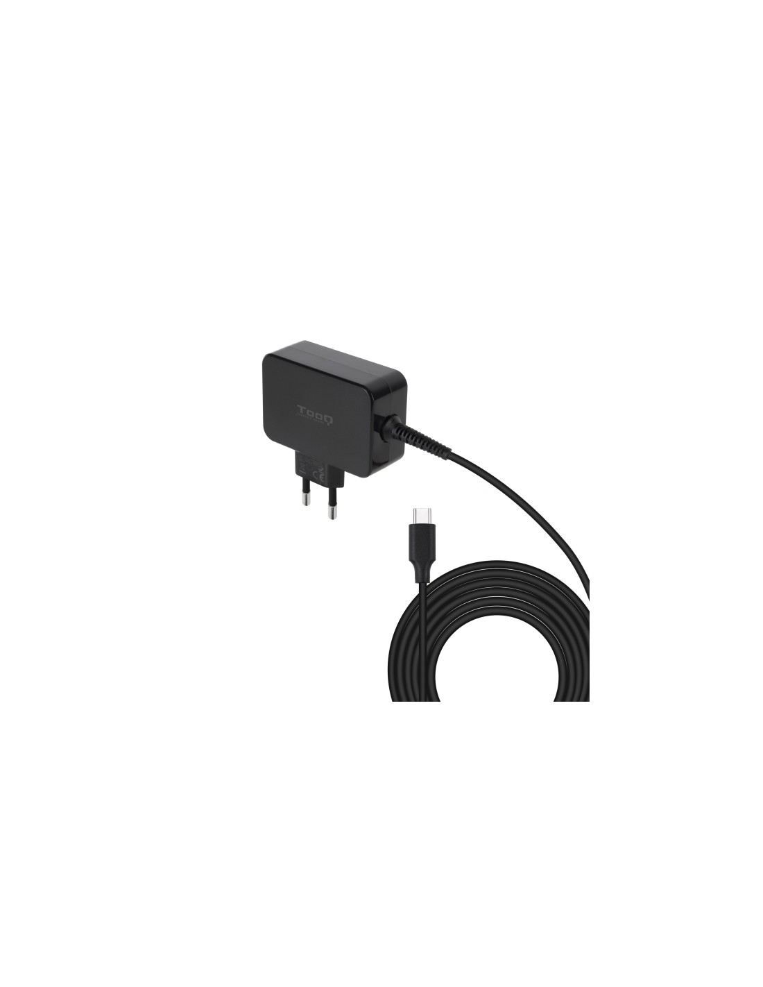 Tooq Cargador de Portatil GaN USB-C/PD 45W - Cable de 1.80m - Color Negro Características: -Fabricado con la tecnología Gan (Nitruro de Galio), que permite un suministro de corriente más eficiente disminuyendo las altas temperaturas que soportan los dispositivos. -Entrada: 110-240V 50/60Hz 1.2A max. -Salidas USB-C: DC5V/3A, DC9V/3A, DC12V/3A, DC15V/3A y DC20V/2.25A -Potencia: 45W -Válido para todo tipo de dispositivos con conector USB-C de carga -Compatible con MAC -Cable de 1.8 metros -Certificación: CE, FCC y RoHS -Color: Negro -Peso neto: 0,131 kg. Peso bruto: 0,183 kg -Medidas del producto: 90x76x30 mm Medidas del embalaje (blíster): 200x150x70 mm Contenido del paquete: -1 x Cargador de pared