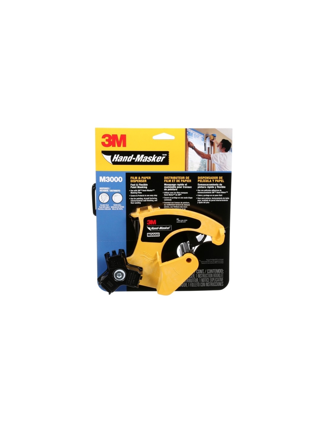 El dispensador de cinta y papel 3M Hand-Masker M3000 ofrece una forma pr ctica de aplicar a la vez cinta y papel para enmascarar. Para una dispensaci n r pida y simult nea de cinta de enmascarar con film o papel para enmascarar, utilice el dispensador 3M Hand Masker M3000. El uso del dispensador es una forma pr ctica y r pida de proteger las superficies de salpicaduras y goteos de pintura, ya que lo enmascara todo, desde los elementos el ctricos hasta paredes enteras. Util celo para cubrir ventanas, puertas, ba eras y muchas otras superficies. Es ideal para un uso profesional e intensivo, ya que aplica f cilmente un film o papel de enmascarar a cualquier cinta de enmascarar profesional de 3M . Es ideal cuando se utiliza con los films para enmascarar avanzados 3M Hand Masker AMF. Caracter sticas: -Compacto y ligero -Agiliza la preparaci n en procesos de pintado, aplicaci n de texturas a techos, acabado de muros exteriores y pulimento de suelos -La elecci n para un uso intensivo y profesional -Uso con la cuchilla para film 3M Hand Masker (se vende por separado) Especificaciones: -Color: Negro, amarillo -Contenido del embalaje: 1 dispensador/paquete -Dispensador: S