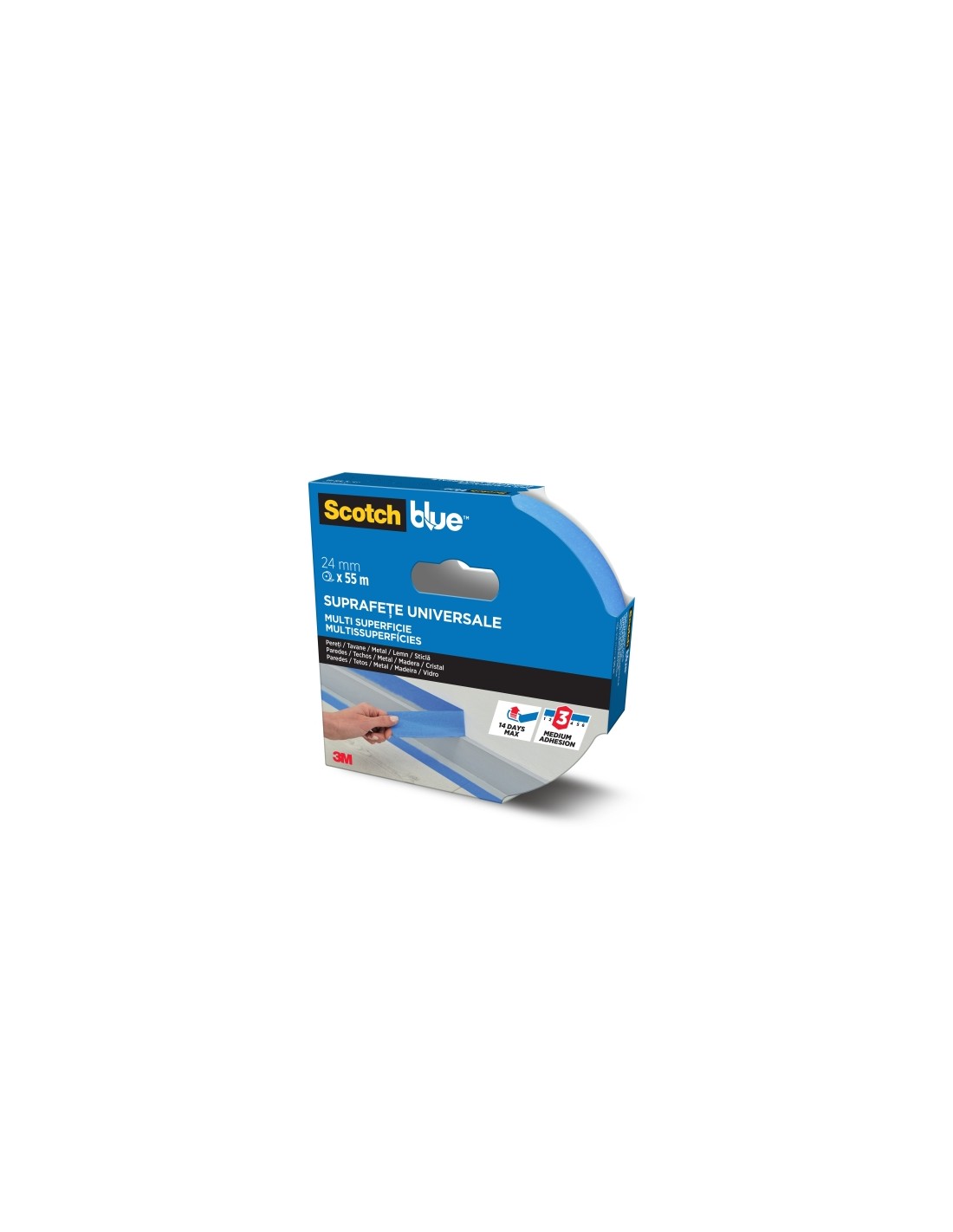 La cinta de enmascarar multisuperficie ScotchBlue tiene un soporte Premium ScotchBlue y alta calidad adhesiva, para lograr resultados profesionales tanto en interiores como en exteriores. Tiene una adhesi n media, se retira f cilmente sin dejar residuos hasta 14 d as despu s de su aplicaci n. Obt n la cinta de enmascarar multisuperficie ScotchBlue para lograr resultados profesionales en la mayor a de las superficies interiores y exteriores. Esta cinta de adhesi n media es muy vers til, ideal para su uso en m ºltiples superficies, como paredes, techos, metal, madera y cristal. Tiene un soporte Premium que garantiza la adaptabilidad a las formas al mismo tiempo que es f cil de rasgar. Al ser resistente a los rayos UV, se puede usar expuesta a la luz solar directa sin riesgo de que queden residuos pegajosos hasta 14 d as despu s de su aplicaci n. Caracter sticas: -Retirada limpia hasta 14 d as despu s de su aplicaci n -Resistente a los rayos UV -Adhesi n media -Se puede utilizar en m ºltiples superficies -Resultados profesionales -El producto cinta de enmascarar est fabricado con papel certificado PEFC, procedente de bosques certificados, renovables y gestionados de forma responsable -Cinta fabricada con un 45 de recursos renovables -Papel fabricado con un 99 de material bio -Adhesivo sin disolventes -Gran versatilidad en interiores y exteriores -F cil de cortar a mano -Ideal para paredes, techos, metal, madera y cristal -CONSEJOS PARA LA APLICACI N DE LA CINTA: Para obtener resultados excelentes, aseg ºrate de que la superficie est limpia, seca y sin polvo para que la cinta se pegue correctamente. A continuaci n, aplica la cinta sobre la superficie al mismo tiempo que presionas hacia abajo al avanzar. Por ºltimo, espera entre 30 y 60 minutos antes de pintar a que la cinta se adhiera -CONSEJOS PARA RETIRAR LA CINTA: Espera hasta que la pintura est seca al tacto antes de retirar la cinta. Lev ntala tirando lentamente de ella hacia atr s y ret rala en un ngulo de 45 grados Especificaciones: -Color: Azul -Contenido del embalaje: 1 Rollo/Paquete -Dispensador: No -Tipo de adhesivo: Acr lico -Propiedades: Reutilizable, resistente a los rayos UV -Aplicaci n: M ºltiples superficies -Ambiente de uso: Interior/Exterior -Etiqueta ECO: 100 PEFC -Tipo de superficie: Adornos, pared pintada, metal, vidrio, baldosa Dimensiones: -Ancho: 24 mm -Espesor: 0.125 mm -Largo: 55 m