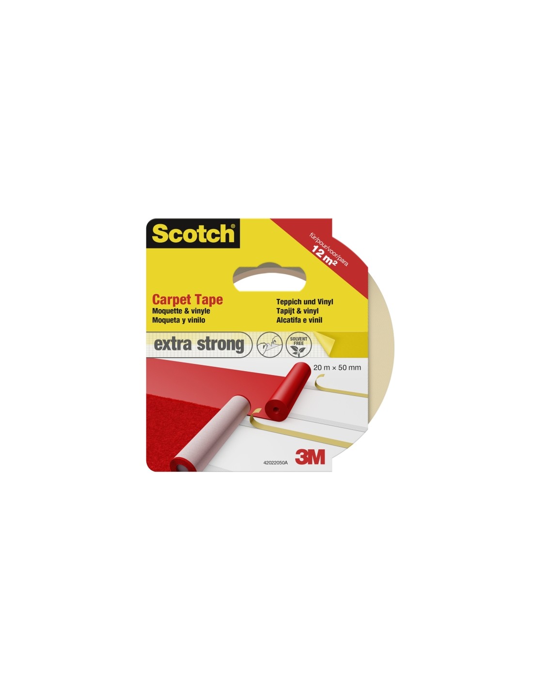 La cinta para moquetas Scotch Premium extra fuerte es una cinta adhesiva de doble cara de alta calidad para todo tipo de moquetas y revestimientos de suelos de PVC con una adherencia extra fuerte. Gracias a su base reforzada con fibra, esta cinta es especialmente adecuada para superficies sometidas a un gran desgaste, como las escaleras. La cinta adhesiva extrafuerte para moquetas se mantiene firmemente en su sitio en muchas superficies subterr neas y tambi n proporciona una fuerza adhesiva ptima en habitaciones expuestas a la humedad, como cuartos de ba o o s tanos. El subsuelo debe estar limpio y seco para conseguir unos resultados de colocaci n ptimos. La cinta Universal es f cil de cortar con la mano y no contiene disolventes ni olor. Extendido simple de alfombras: Es posible extender todo tipo de alfombras y cubiertas para pisos de PVC con rapidez y facilidad con la cinta adhesiva para alfombras extrafuerte Scotch de doble faz. Debido a su base reforzada con fibra, es particularmente apta para superficies sometidas a desgaste intenso, como por ejemplo, escaleras. La cinta adhesiva para alfombras permanece inmovilizada en muchas subsuperficies y tambi n brinda ptima resistencia adhesiva en habitaciones expuestas a humedad, como ba os y s tanos. La subsuperficie debe estar limpia y seca para lograr los mejores resultados de cobertura. La cinta adhesiva se puede rasgar con facilidad a mano y debido a su recubrimiento adhesivo sin solventes, la cinta adhesiva para alfombras Scotch es un producto ecol gico. Caracter sticas: -Cinta adhesiva de alto rendimiento: La cinta adhesiva para alfombras extrafuerte Scotch de doble faz es ideal para zonas sometidas a desgaste extremo -Amplia diversidad de usos: Es apta para usar con todo tipo de alfombras y cubiertas para pisos de PVC y se puede utilizar en muchas subsuperficies, como por ejemplo, habitaciones h ºmedas o calefacci n debajo del piso -Permanentemente segura: La cinta adhesiva reforzada con fibra tiene un poder adhesivo especialmente grande y ofrece adherencia permanente y segura aunque est sometida a gran desgaste, como por ejemplo, en escaleras -Puede rasgar la cinta adhesiva simplemente a mano -Sin solventes: Su recubrimiento adhesivo sin solventes significa que no da a el medio ambiente y tampoco despide olor -Aplicaci n: Para una adherencia ptima, las superficies deben estar secas y limpias Especificaciones: -Color: Blanco -Contenido del embalaje: 1 rollo -Tipo de adhesivo: Caucho -Propiedades: Doble cara -Aplicaci n: Suelo -Ambiente de uso: Interior -Tipo de uso: Moqueta Dimensiones: -Ancho: 50 mm -Espesor: 0.163 mm -Largo: 20 m