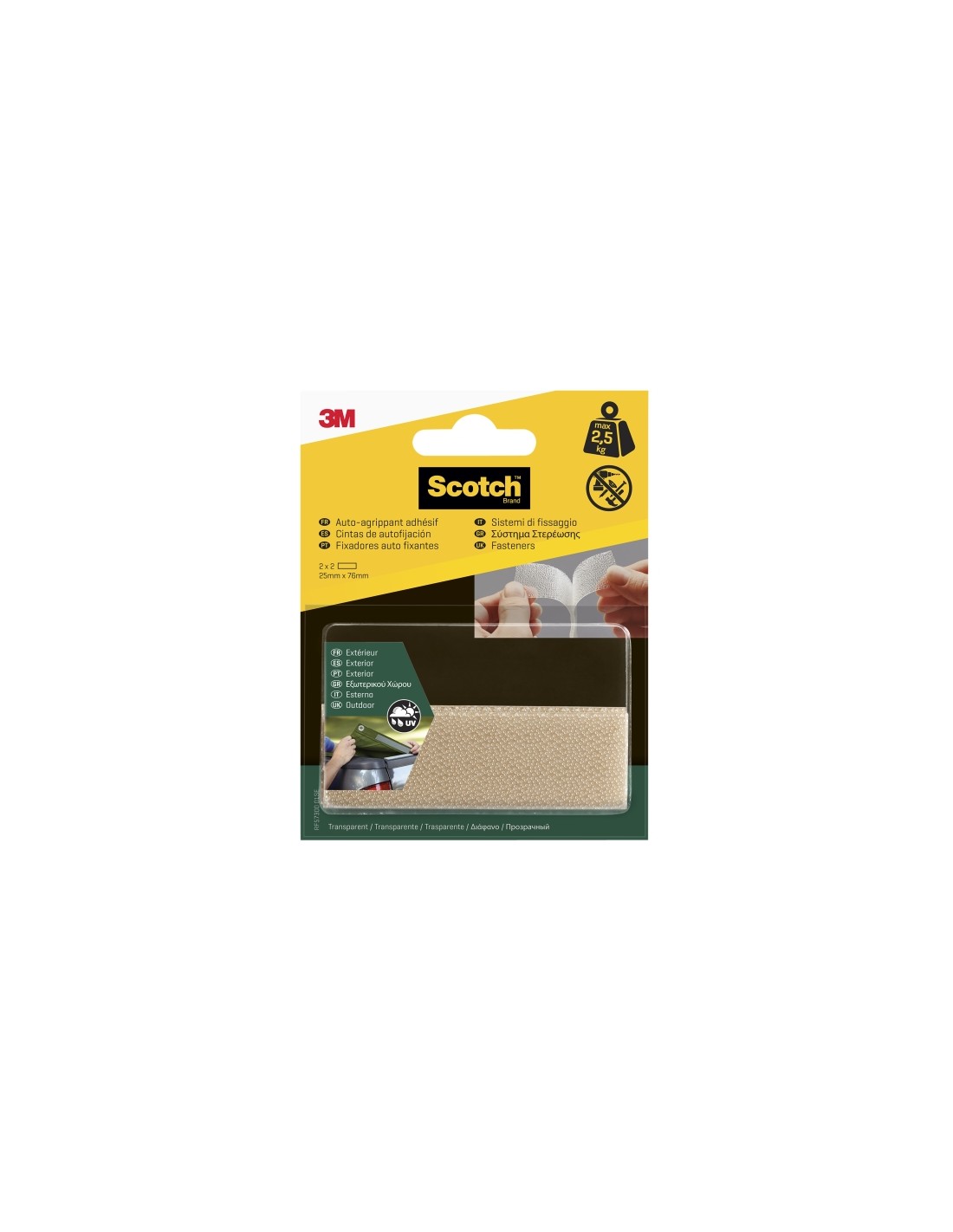 Los cierres reposicionables para exterior Scotch son fijaciones autoadhesivas de gancho y bucle de uso intensivo que permiten la sujeci n s lida y segura de objetos a paredes y otras superficies. Son resistentes a los rayos UV y al agua, lo que los hace ideales para objetos que desees fijar y reposicionar en exteriores, con una sujeci n de hasta 2.5 kg. Fija o monta objetos de hasta 2.5 kg con los cierres reposicionables para exterior Scotch . Estas sujeciones autoadhesivas de gancho y bucle de uso intensivo se fijan con mucha fuerza a superficies pintadas o barnizadas, metal, pl stico, vidrio, azulejos o madera. Son resistentes a los rayos UV y al agua, lo que los hace ideales para organizar, fijar y montar cualquier objeto en exteriores, desde felpudos y adornos navide os hasta lonas en el jard n o herramientas en el garaje. Caracter sticas: -Cierres adhesivos de gancho y bucle muy fuertes para fijar objetos que se quieran reposicionar despu s del uso -Soporta hasta 2.5 kg -Resistentes a los rayos UV y al agua -Para uso en exterior -Ideales para su uso en superficies pintadas o barnizadas, metal, pl stico, vidrio, azulejos o madera -Permanecen fijos incluso cuando est n h ºmedos y sucios -Perfectos para superficies que se mueven o vibran -Disponibles en un paquete de dos pares transparentes, 25 mm x 76 mm Especificaciones: -Color: Incolora -Contenido del embalaje: 2 juegos/paquete -Ambiente de uso: Exterior Dimensiones: -Ancho: 25 mm