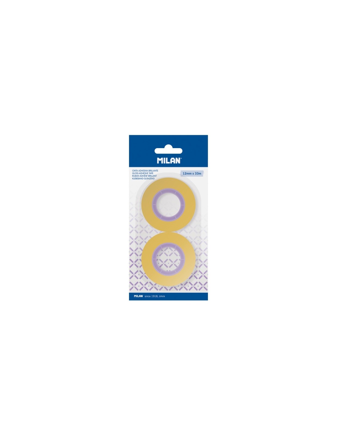 Bl ster que contiene dos cintas adhesivas transparentes de la marca Milan, de 12mm de ancho y 33 metros de longitud cada una. Caracter sticas: -Bl ster -2 cintas adhesivas Milan -Ancho: 12mm -Longitud: 33m cada una -Transparente, tono amarillo claro -Acabado brillante -Uso: embalaje, reparaci n -Adhesivo discreto y resistente