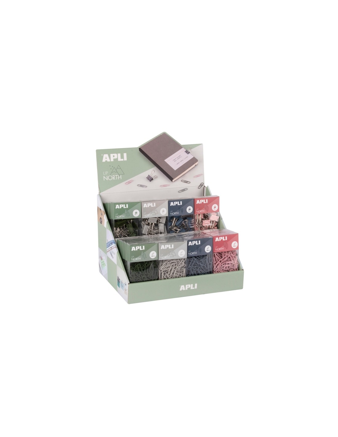 Apli Up North Expositor con 16 Cajas de 140 Clips 28mm-16 Cajas de 15 Pinzas Metalicas 19mm - Colores Surtidos