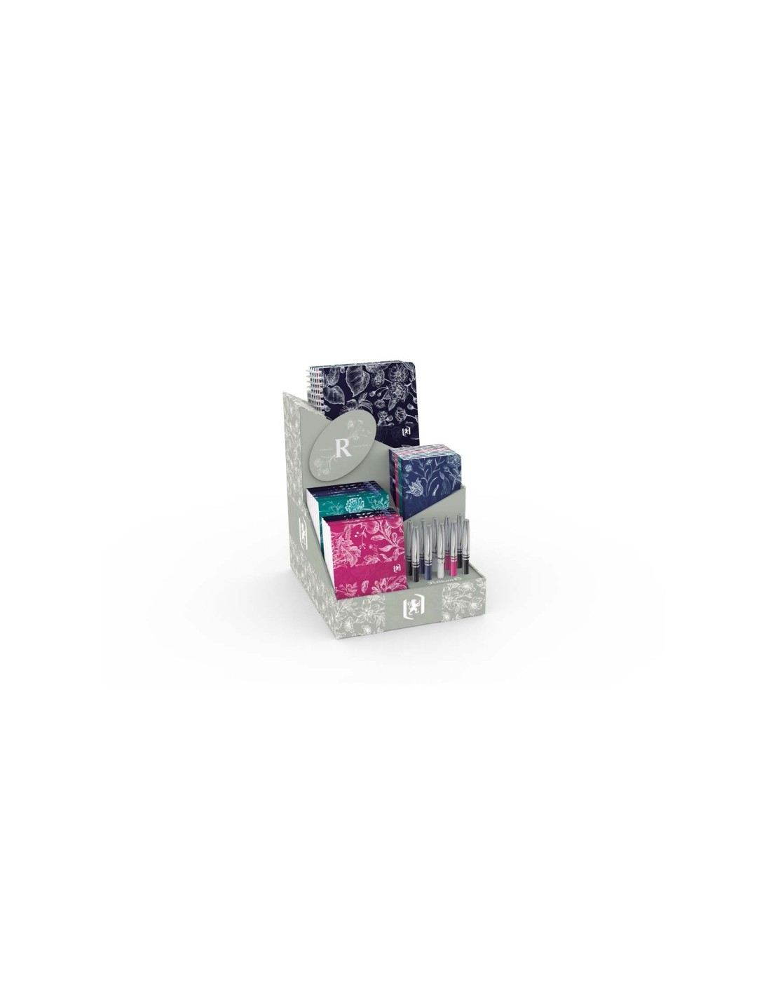 Oxford Romance Expositor de sobremesa con: -10 Blocs Grapados A6 -10 Libreta Grapadas A6 -5 Cuadernos Espiral A5 -10 Boligrafos
