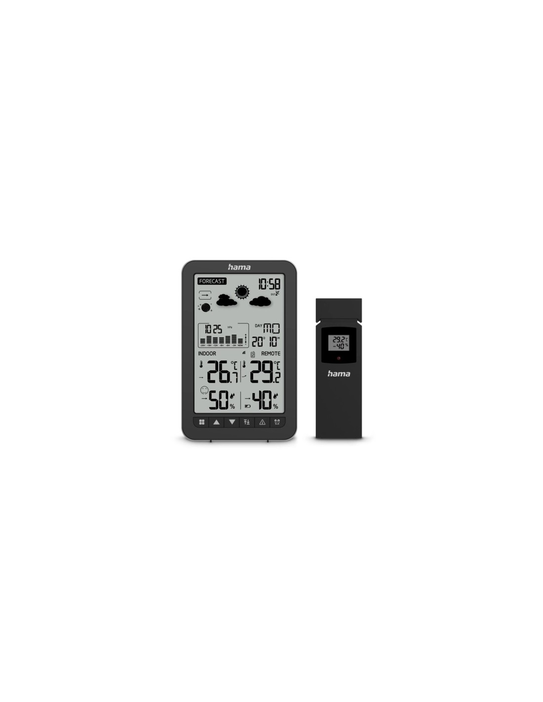 La estaci n meteorol gica Hama Ko Samui combina funcionalidad y dise o en un dispositivo compacto y elegante en color negro, ideal para quienes desean mantenerse informados sobre las condiciones clim ticas en su hogar o en exteriores. Con una pantalla digital de f cil lectura, muestra de manera clara y precisa la temperatura interior y exterior, la humedad del aire en ambos entornos, la hora, la fecha, el d a de la semana y la previsi n meteorol gica mediante cinco s mbolos que representan condiciones soleadas, nubes ligeras, nublado, lluvia y nieve. Adem s, su sensor exterior, con alcance de hasta 50 metros y frecuencia de 433 MHz, permite monitorear en tiempo real las condiciones atmosf ricas en exteriores, incluyendo la presi n barom trica y la tendencia de la temperatura y humedad, facilitando la planificaci n y la preparaci n ante cambios clim ticos. Este modelo cuenta con funciones adicionales que aumentan su utilidad, como la alarma de heladas que se activa entre -1 C y 1 C, permitiendo tomar precauciones para evitar da os por hielo o nieve. El reloj de radio DCF se ajusta autom ticamente a la hora m s precisa, con la opci n de ajuste manual para zonas horarias diferentes, garantizando siempre la informaci n horaria correcta. El indicador de confort, representado por tres caras (neutral, sonriente y triste), ayuda a evaluar r pidamente las condiciones del ambiente interior, mientras que la visualizaci n de las fases lunares a ade un toque est tico y funcional para quienes disfrutan del seguimiento astron mico. La estaci n tambi n incorpora un sistema de memoria de datos y un indicador de capacidad de bater a, asegurando un funcionamiento confiable y duradero. Construida con materiales sostenibles, su empaque certificado FSC refleja un compromiso con la gesti n responsable de los recursos naturales. Con un dise o que permite tanto el montaje de pie como colgado, su tama o compacto de 10.5 x 2.5 x 16cm facilita su colocaci n en cualquier espacio. La estaci n funciona con bater as AAA Micro, tanto en la unidad principal como en el sensor exterior, garantizando una operaci n sencilla y sin complicaciones. En definitiva, la Hama Ko Samui es una herramienta completa y elegante que combina tecnolog a avanzada con respeto por el medio ambiente, perfecta para quienes desean tener un control preciso y visual de las condiciones clim ticas en su entorno. Caracter sticas: -Color: Negro -Luz de Fondo: Blanco -Tono del Color: Negro -Tipo de clavija del conector de alimentaci n: Euroconector, tipo C (CEE 7/16) -Alcance del sensor exterior por radio: 50 m -frequency outdoor sensor: 433 MHz -Sensor exterior de la pantalla: Higr metro, Term metro -Funciones Adicionales: Alarma de heladas, Indicador de Confort, Indicador de la capacidad de la bater a, Memoria de datos, Previsi n Meteorol gica, Reloj DCF-Radio, Sensor exterior, Temperatura, Visualizaci n de las fases lunares, visualizaci n de la tendencia de la presi n atmosf rica -Higr metro exterior: 20-95 -Higr metro Interior: 20-95 -Modo de Funcionamiento: Radio -Montaje: Se mantiene de pie, Se puede colgar -Pantalla: Digital -Rango de medici n de la humedad: 20 to 95 -Rango de medici n de la temperatura: Exterior: -40 C bis 60 C /Interior: 0 C hasta 50 C (32 F hasta 122 F) -Resoluci n de la temperatura: 0.1 -Temperature Accuracy (Indoor): 1 C -Ancho x Produndo x Alto: 10.5 x 2.5 x 16 cm -N ºmero de Bater as de la Estaci n: 3 -N ºmero de Bater as del Sensor Exterior: 2 -Tipo de Bater a de la Estaci n: AAA Micro -Tipo de Bater a del Sensor Exterior: AAA Micro