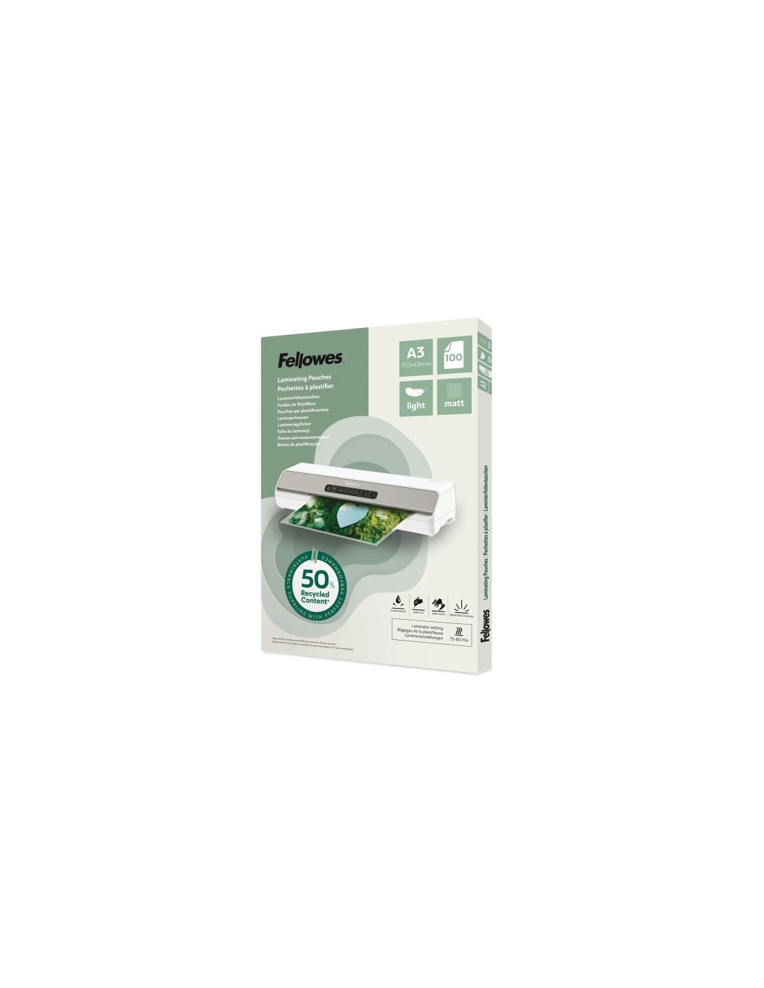 Fellowes Pack de 100 Fundas para Plastificar - Formato A3 - 80 micras - Efecto Mate - Fabricado con 50-Material Reciclado -