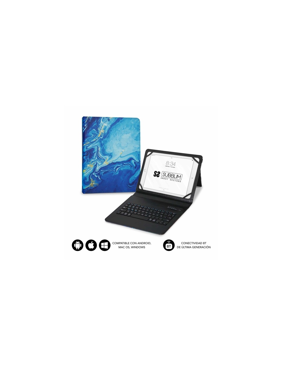 Este Teclado Bluetooth va integrado en la funda de alta calidad compatible con todas las Tablet del mercado de 9,6 a 11 . El dise o de M rmol Azul simboliza la concentraci n, la tranquilidad y la calma, adem s de mejorar la comunicaci n con otras personas. Se conecta a la perfecci n con cualquier dispositivo compatible con la tecnolog a Bluetooth de ºltima generaci n 5.2 para una escritura m s r pida y c moda. Un mecanismo de resorte debajo de cada tecla asegura una respuesta t ctil con cada golpe, lo que le ayuda a escribir m s r pido y con menos errores que en una pantalla t ctil. El dise o de la funda Ultradelgada agrega la m xima protecci n con un volumen m nimo. La puedes posicionar en modo Stand para una correcta escritura o visionado de v deos. Esta funda vers til y protectora de SUBBLIM presenta un teclado integrado que permite un transporte m s liviano. Podr s cambiar entre el trabajo y el juego con facilidad en cualquier lugar donde lo uses. Especificaciones: -Teclado en Espa ol con tecnolog a Bluetooth integrado y funda para Tablet de hasta 11 . -Versi n inal mbrica 5.2 que soporta la conexi n de hasta 3 dispositivos en diferentes canales. -Compatible con dispositivos Windows 8/10/11, AndroidTM, iOS/iPadOS 13 y MacOs. -Uso con iPad 10.2 , Samsung Tab A8, A7, Lenovo Tab M10, M10 FHD, Huawei, Xiaomi, TCL, SPC, Denver, Alcatel. -Bater a de Li-Ion de 300Mha con una alta duraci n (30 d as de trabajo). -Ahorro de energ a autom tico y menor consumo. -Resistente material exterior con acabado en PU. -Acceso exclusivo a los botones y puerto de carga. -Sistema de cierre mediante banda el stica para un transporte seguro.