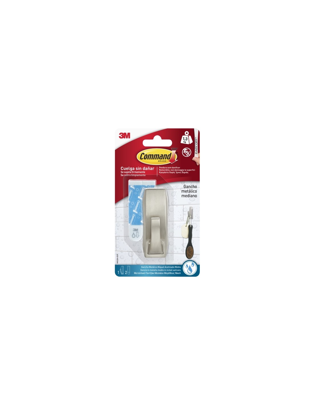 Los ganchos para ba o medianos con reflejos modernos Command incluyen tiras resistentes al agua y son nuestra innovadora soluci n para colgar utensilios de cocina y ba o y otros objetos de peso medio en lugares h ºmedos con seguridad y sin ocasionar da os. Se sujetan firmemente y se retiran de forma limpia gracias a la tecnolog a de estirar y soltar de 3M. Cuelga toallas y otros objetos del ba o en entornos h ºmedos con el gancho met lico de color n quel satinado para ba o mediano Command . Este gancho met lico de primera calidad aporta un toque de estilo a cualquier ba o o vestuario. Se sujetan firmemente a una amplia variedad de superficies, ya sean paredes pintadas, s lidas o huecas, as como a otros materiales como madera, azulejos, metal y cristal. Se colocan y retiran f cilmente, sin dejar agujeros, marcas ni residuos pegajosos. Nuestro gancho y nuestras tiras son perfectos para colgar objetos de peso medio en lugares h ºmedos, como ba os y cocinas. Volver a colgarlo es tan sencillo como colocar una tira de repuesto Command , por lo que puedes retirarlo, moverlo y reutilizarlo una y otra vez. Caracter sticas: -Se cuelgan sin ocasionar da os, se sujetan firmemente y se retiran sin dejar rastro -Son f ciles de colocar, sin necesidad de tornillos, clavos ni agujeros -Las tiras se retiran limpiamente, sin dejar agujeros, marcas ni residuos pegajosos -Adecuado para la mayor a de superficies lisas, como paredes pintadas, azulejos y cristal -Las tiras resistentes al agua funcionan tanto en condiciones de humedad como de sequedad. Perfecto para su uso en azulejos para evitar tener que realizar perforaciones y da ar el azulejo -Poder de sujeci n: 1.3kg -Tama o: Mediano -Contenido del paquete: 1 gancho y 2 tiras medianas -Color: N quel satinado -Tipo de tira: Resistente al agua Especificaciones: -Contenido del embalaje: 1 gancho, 2 tiras -Uso: Interior -Material: Metal -Peso soportado (sistema m trico): 1.3kg -Tama o: Mediano Dimensiones: -Anchura total (sistema m trico): 29 mm