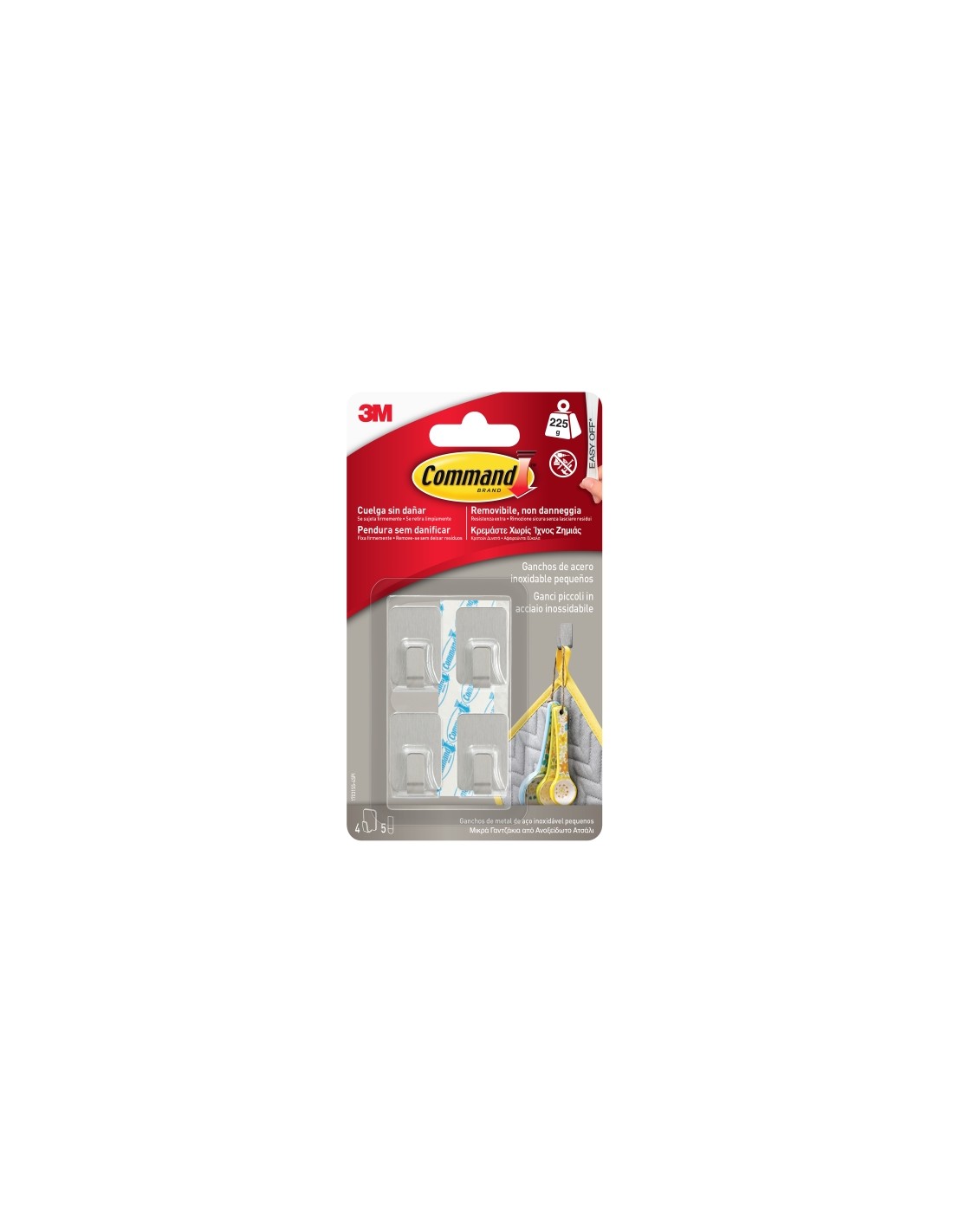 Los ganchos peque os de acero inoxidable Command son la soluci n perfecta para organizar y decorar tus espacios sin da ar las superficies. Dise ados para ofrecer una sujeci n firme y una f cil remoci n, estos ganchos permiten mantener tus paredes en perfecto estado sin dejar marcas ni residuos. Ideales para colgar objetos ligeros, son una opci n pr ctica y est tica para cualquier ambiente. Caracter sticas: -Fijaci n sin da o: se adhieren sin necesidad de perforar ni usar herramientas que puedan da ar las superficies. -Sujeci n segura: mantienen los objetos firmemente en su lugar, incluso en superficies lisas y delicadas. -Remoci n limpia: se retiran sin dejar agujeros, marcas, residuos pegajosos ni manchas. -Material duradero: fabricados en acero inoxidable, resistentes a la corrosi n y al uso diario. -Vers tiles: aptos para diversas superficies y objetos ligeros como decoraciones, utensilios, llaves, entre otros. -Capacidad de carga: hasta 225g