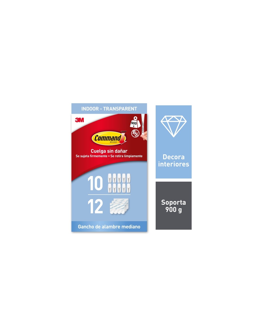 Transforma tu espacio con estilo y funcionalidad Descubre la soluci n perfecta para mantener todo organizado sin sacrificar la est tica de tus ambientes. Presentamos el Gancho Punta Met lica Mediano Transparente Command CL065-10, un producto innovador que combina practicidad y dise o elegante para que puedas colgar tus objetos favoritos de manera sencilla y sin da ar las superficies. Caracter sticas: -Dise o transparente y discreto que se integra f cilmente en cualquier decoraci n. -Tecnolog a de adhesi n avanzada que garantiza una sujeci n segura y confiable. -F cil de instalar y retirar, sin dejar residuos ni da ar las paredes. -Ideal para uso en casa, oficina, taller o cualquier espacio que requiera organizaci n. -Reutilizable y resistente, apto para colgar accesorios, utensilios de cocina, decoraciones y m s. -Capacidad de carga: 900g Especificaciones: -Incluye: 10 ganchos y 12 tiras adhesivas.