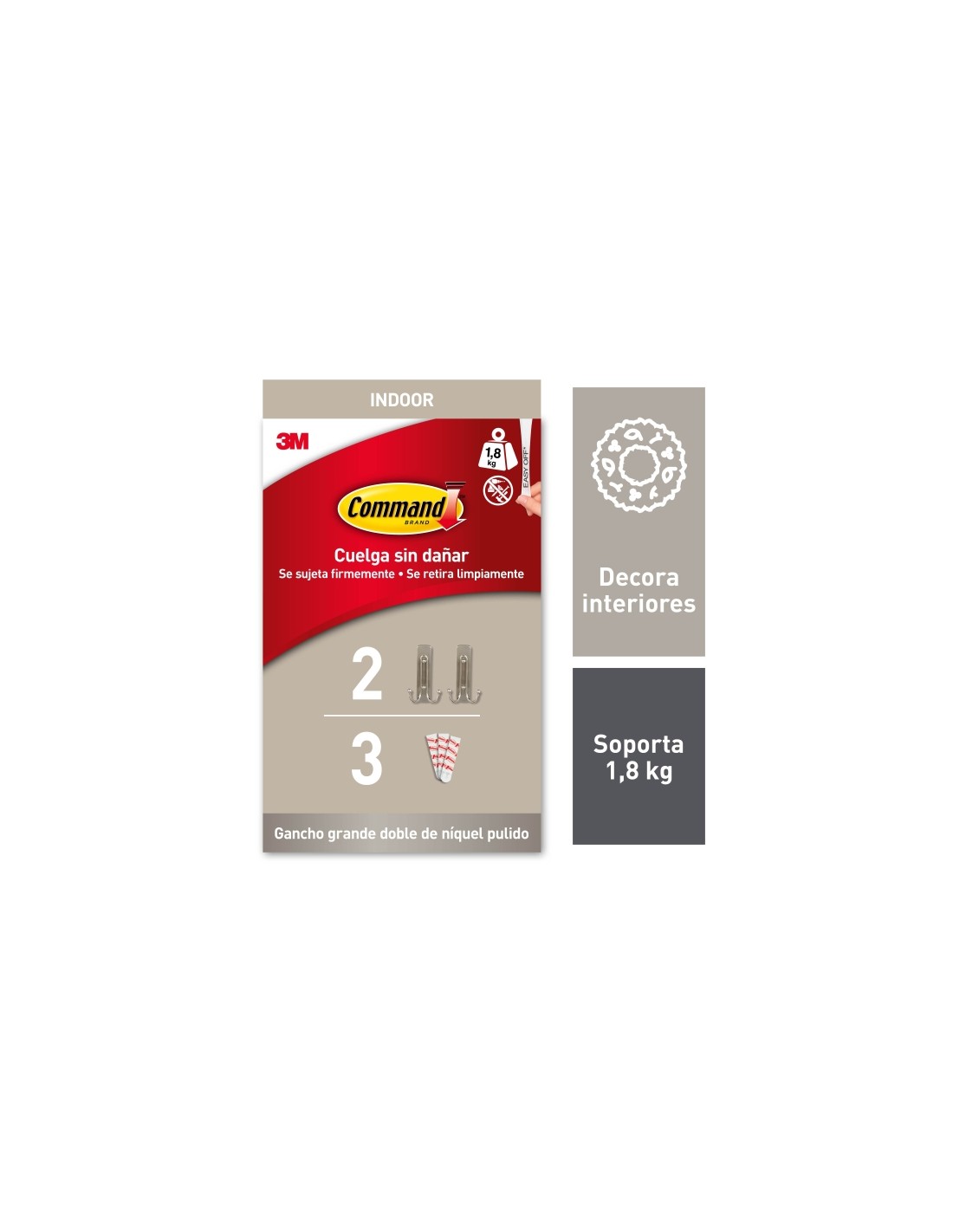 Command Pack de 2 Ganchos Dobles Grandes - 3 Tiras Adhesivas - Soporta hasta 1.8kg - Color Niquel