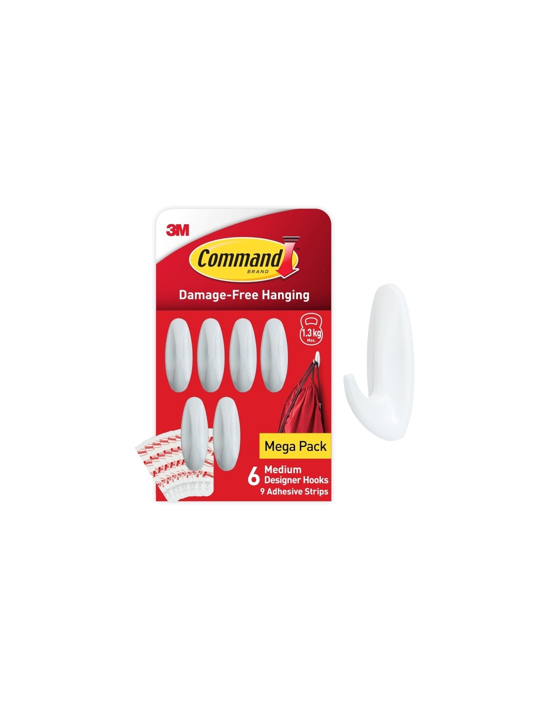Command Pack de 6 Ganchos de Diseño Medianos - 9 Tiras Adhesivas - Soportan hasta 1.3kg - Color Blanco
