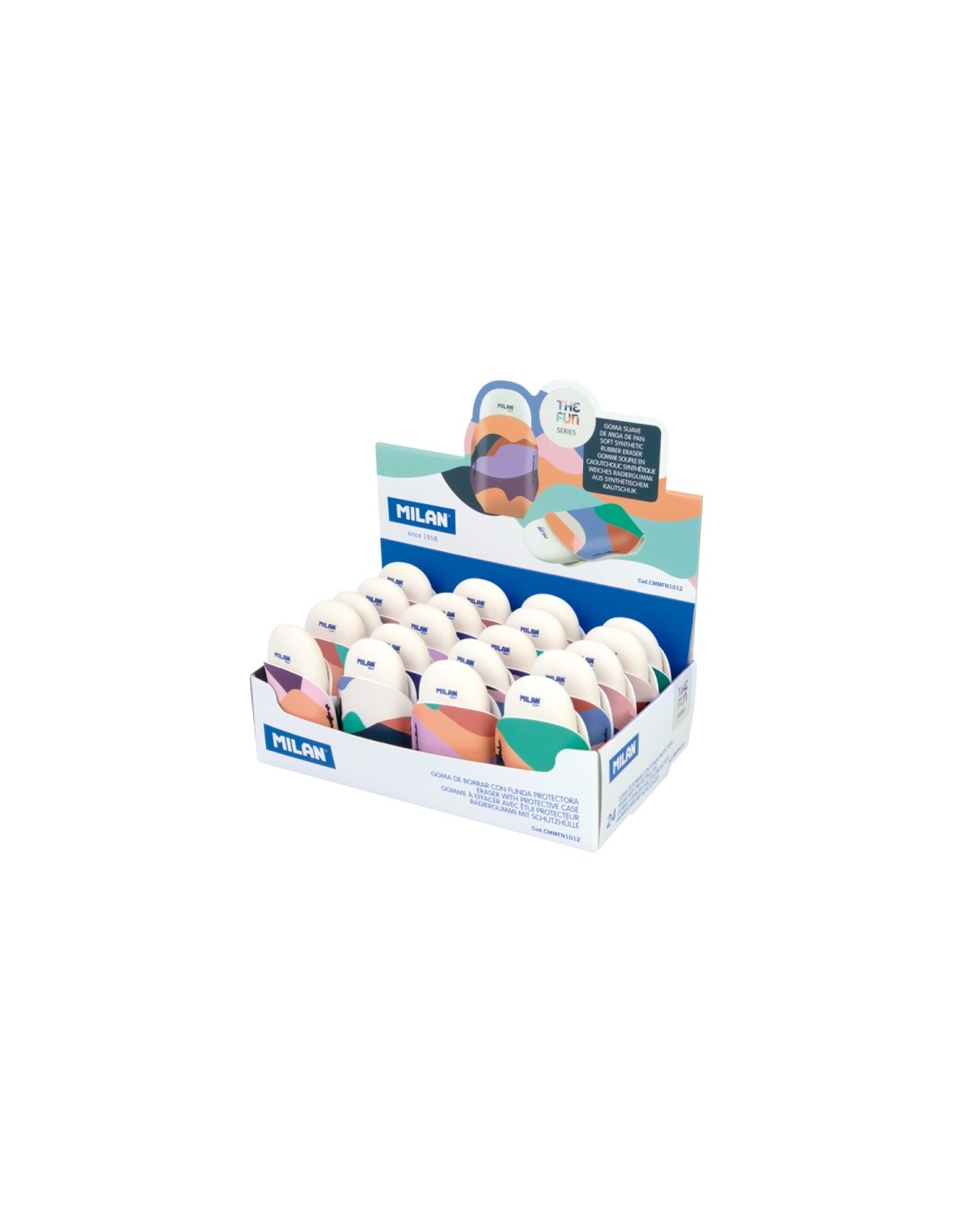Milan The Fun 1012 Expositor con 24 Gomas de Borrar con Funda - Miga de Pan - Caucho Sintetico - Ovaladas - Colores Surtidos
