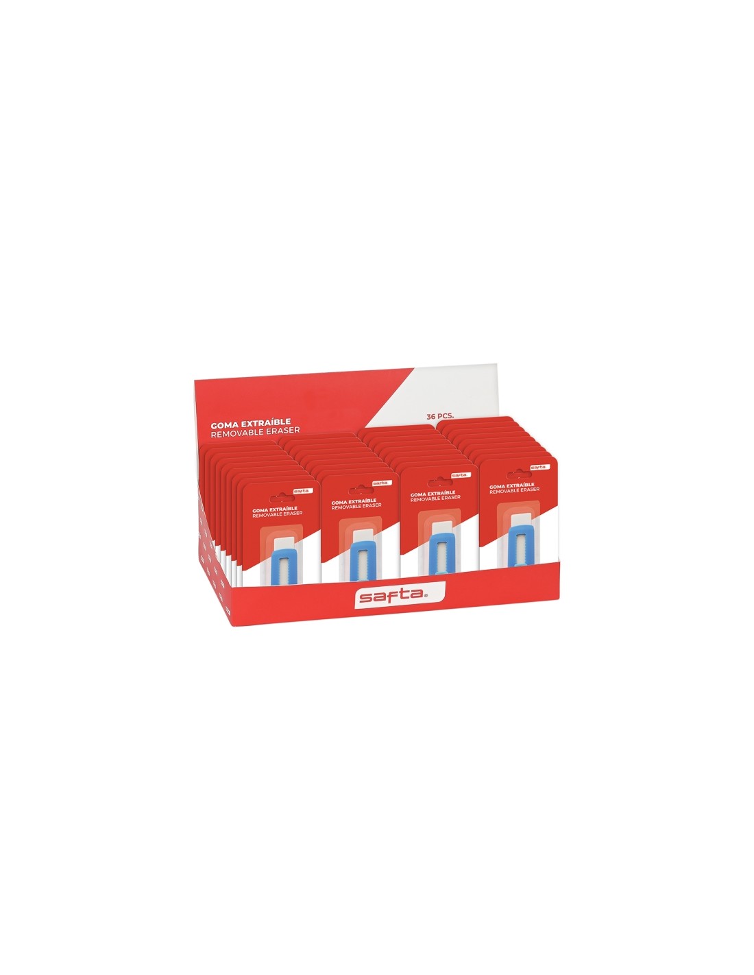 Safta Expositor con 36 Gomas Extraibles - Ergonomico - Estilo Cutter - Color Azul y Blanco