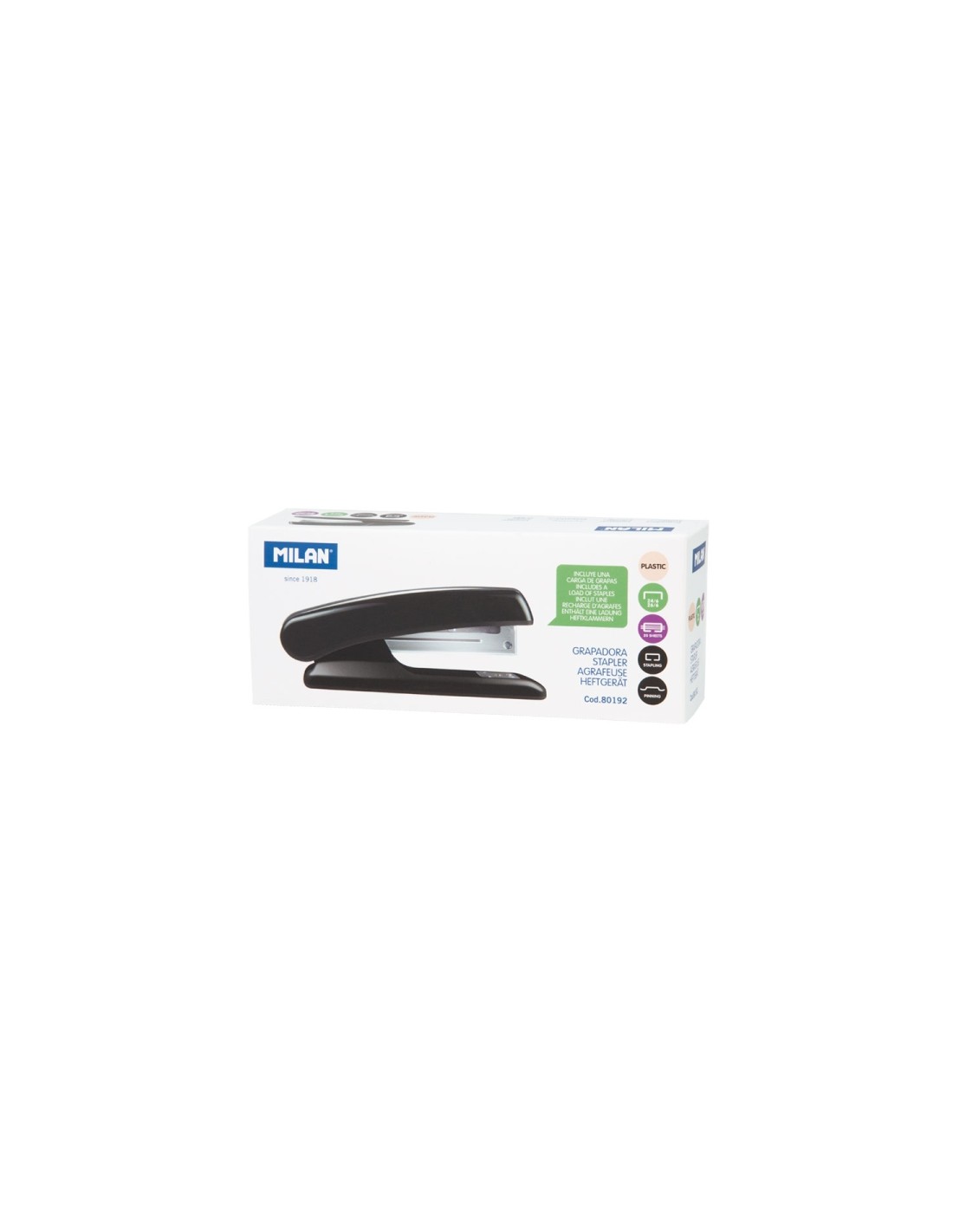 Grapadora met lica negra de la marca Milan. Caracter sticas: -Material: met lica (cuerpo), pl stico r gido (base) -Color: negro -Longitud de base: 12.5cm -Canal con impulsor de grapas -Accionado por resorte met lico el stico -Grapado suave y preciso -Compatible con: grapas 24/6 y 26/6 -Capacidad de grapado: hasta 20 hojas -Carga m xima: 100 grapas (24/6) o 105 grapas (26/6) -Incluye grapas para uso inmediato