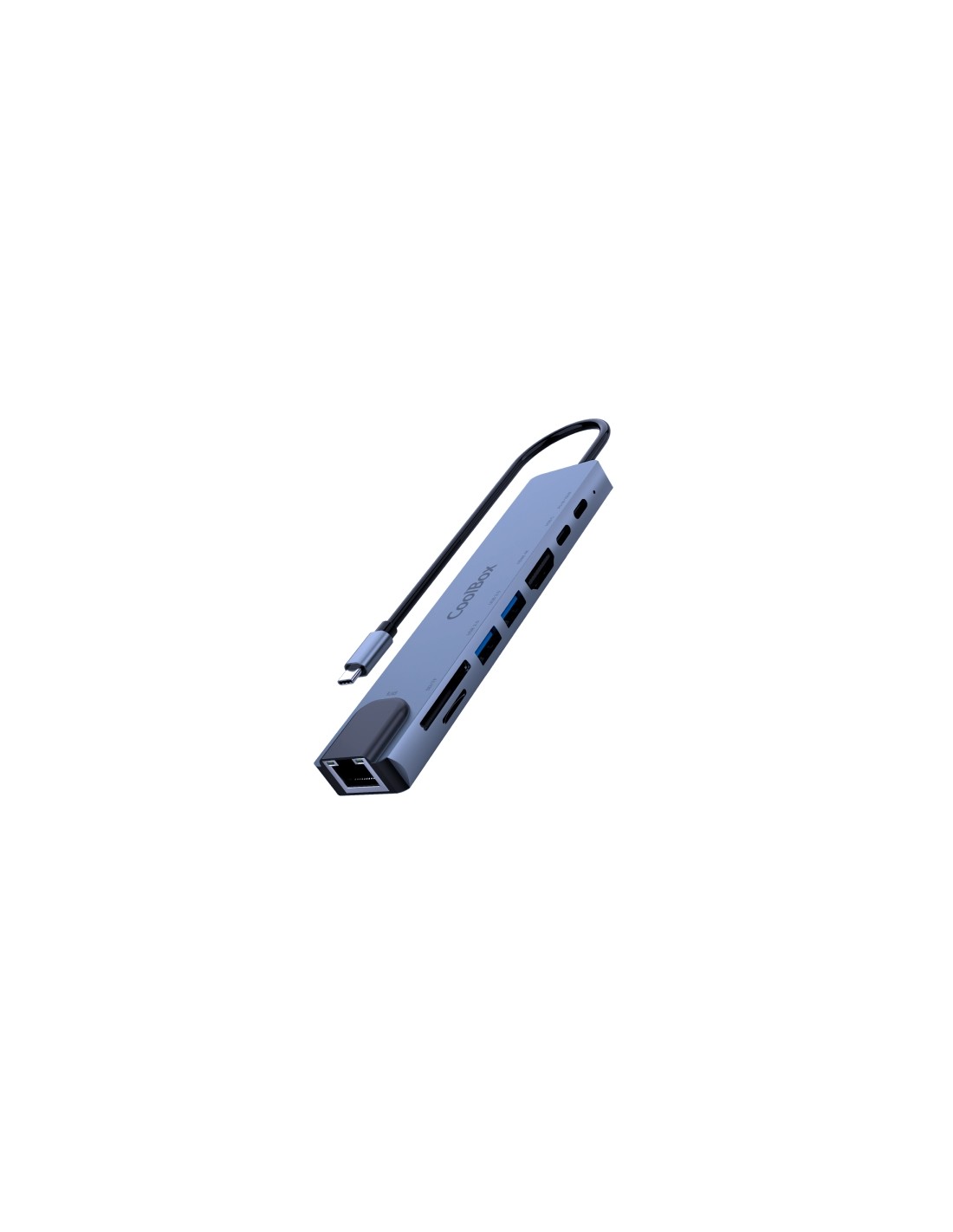 Ampl a f cilmente la conectividad de tu port til. All in one solution CoolBox miniDock C81 es un adaptador de extensi n port til que le permite ampliar las prestaciones de su port til gracias a sus puertos HDMI 4K, 2 x USB-A 3.2 Gen1, 1 x USB-C Power Delivery 100W, 1 x USB-C con transferencia de datos 2.0, 1 x SD/mucroSD y 1 x RJ45. El dise o port til del hub CoolBox es excelente para los viajeros y para aquellos profesionales que necesiten una movilidad extra y las mejores prestaciones sin ocupar mucho espacio. Caracter sticas: -Mejora la conectividad de ordenadores port tiles o ultrabooks con pocos puertos. Tendr s todas los puertos de conexi n en una ºnica soluci n. -7 puertos: 1 x HDMI, 2 x USB 3.2 Gen1 (USB-A), 1 x USB-C, 1 x USB-C Power Delivery, 1 x SD/microSD, 1 x RJ45 -Amplia compatibilidad: Chromebooks y ultrabooks con puerto USB-C Apple MacBook Smartphones con puerto USB-C Consolas port tiles como: SteamDeck y Nintendo Switch 6.2 para carga y salida de v deo -Facilidad de uso: Plug Play Especificaciones: -Conexi n: USB 3.0 (3.2 Gen 1) Tipo-C -Material: Aluminio. Cable PVC -Color: Gris espacial, cable negro -Longitud de cable: 195 mm -Dimensiones: 145 x 33 x 14 mm -Peso: 64 gramos Puertos: -1x HDMI 4k 30Hz, compatible con 1080p y 720p -2x USB-A 3.0 con transferencia de datos hasta 5Gbps (5V 1A) -1x USB-C 3.0 Power Delivery hasta 100W (5 20V/5A) -1x USB-C con transferencia de datos 2.0 hasta 480Mbps -1x SD/microSD 2.0 de velocidad 480Mbps, solo puede leer 1 tarjeta a la vez. -1x RJ45 10/100/1000Mbps