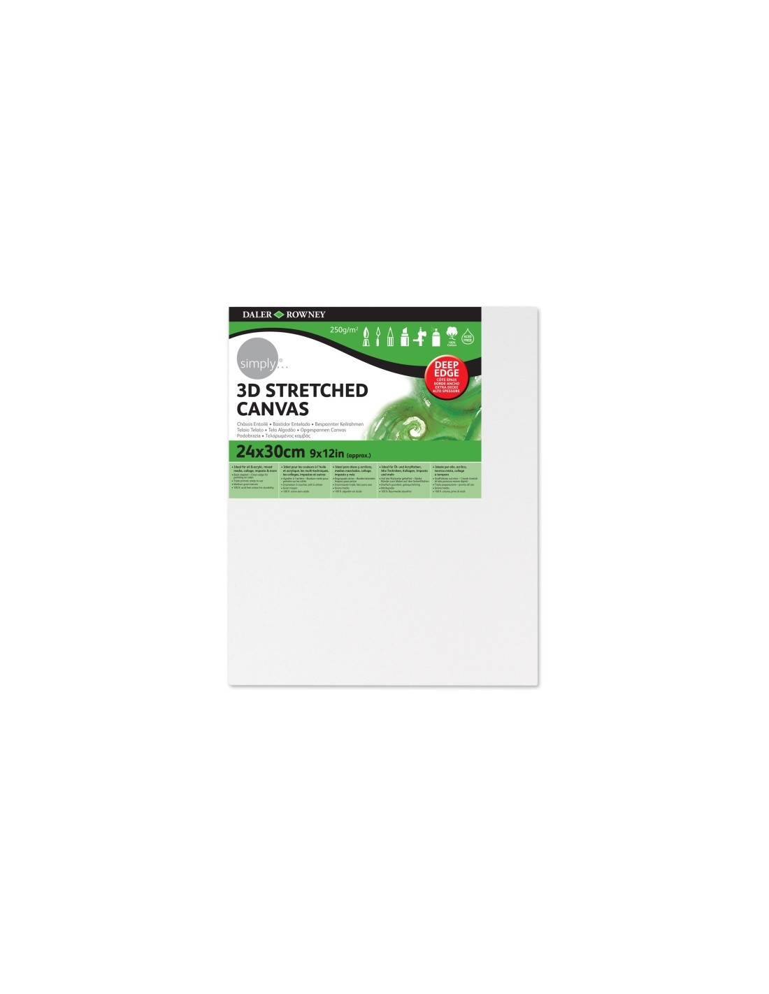 Daler-Rowney Simply Stretch 3D / Deep Edge Canvas 24x30cm/12x9in tiene 250g, 100 algod n, tela de lienzo de triple imprimaci n con marco de madera. El lienzo est impreso con triple imprimaci n, creando una superficie perfecta lista para usar tanto para leos como para acr licos, manteniendo la pintura en la superficie y evitando la filtraci n de cualquier aceite a trav s de la parte posterior. Todos los lienzos tensados est n grapados por detr s con bordes limpios y se pueden colgar sin enmarcar. Los lienzos Simply son vers tiles y tambi n son adecuados para t cnicas mixtas, collage, impasto y texturas pesadas. Daler-Rowney Simply est dise ado espec ficamente para dar a los artistas principiantes y en ciernes por igual la oportunidad de probar algo nuevo, simplemente pintar, simplemente dibujar, simplemente crear La gama Simply tiene una excelente relaci n calidad-precio, sin dejar de ser fiable y de alto nivel, y ofrece una amplia gama de pinturas, medios, cuadernos de dibujo, lienzos y accesorios. Caracter sticas: -Ideal para leos y acr licos, medios mezclados, collage, impasto y m s. -Engrapado atras. Bordes laterales limpios para pintrar. -Imprimaci n triple, listo para usar. -Grano medio. -100 algod n sin cido.