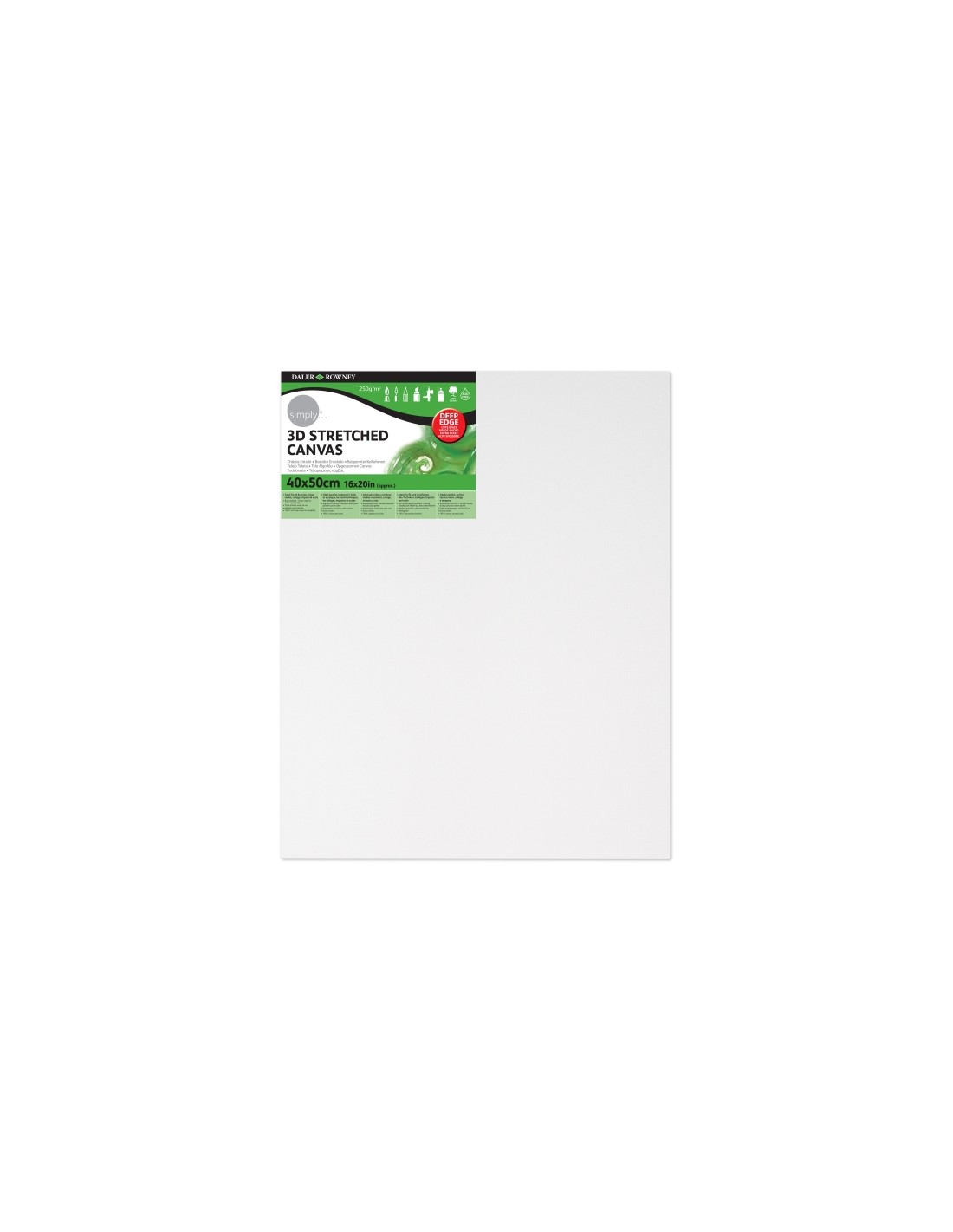 Daler-Rowney Simply Stretch 3D / Deep Edge Canvas 40x50cm/16x20in tiene 250g, 100 algod n, tela de lienzo de triple imprimaci n con marco de madera. El lienzo est impreso con triple imprimaci n, creando una superficie perfecta lista para usar tanto para leos como para acr licos, manteniendo la pintura en la superficie y evitando la filtraci n de cualquier aceite a trav s de la parte posterior. Todos los lienzos tensados est n grapados por detr s con bordes limpios y se pueden colgar sin enmarcar. Los lienzos Simply son vers tiles y tambi n son adecuados para t cnicas mixtas, collage, impasto y texturas pesadas. Daler-Rowney Simply est dise ado espec ficamente para dar a los artistas principiantes y en ciernes por igual la oportunidad de probar algo nuevo, simplemente pintar, simplemente dibujar, simplemente crear La gama Simply tiene una excelente relaci n calidad-precio, sin dejar de ser fiable y de alto nivel, y ofrece una amplia gama de pinturas, medios, cuadernos de dibujo, lienzos y accesorios. Caracter sticas: -Ideal para leos y acr licos, medios mezclados, collage, impasto y m s. -Engrapado atras. Bordes laterales limpios para pintrar. -Imprimaci n triple, listo para usar. -Grano medio. -100 algod n sin cido.