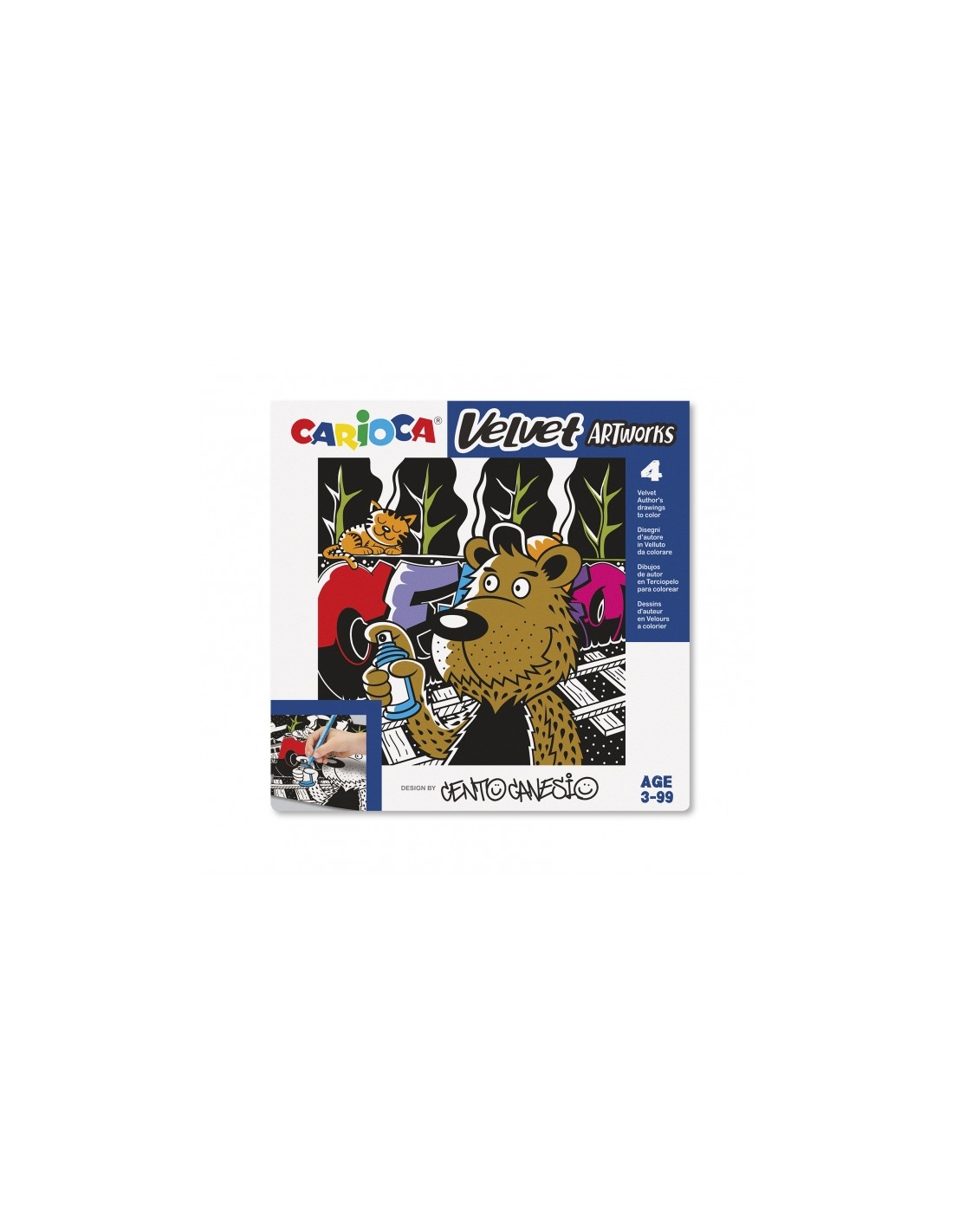 Carioca Velvet Centograffiti Pack de 4 Ilustraciones de Terciopelo para Colorear - Suave Textura - Desarrolla Destreza y Creatividad - Colaboracion con Cento Canesio Características: -Set de 4 ilustraciones de terciopelo para colorear -La suave textura guía la mano mientras se colorea -Ayuda a desarrollar la destreza y la creatividad -Realizado en colaboración con Cento Canesio