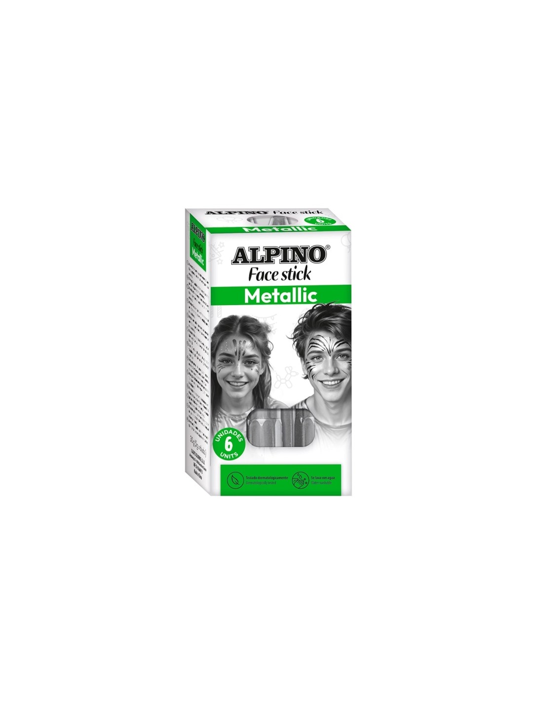 Las barritas de maquillaje Face Stick de Alpino son perfectas para disfrutar de fiestas de disfraces, Halloween o Carnaval. Con ellas te convertir s en la princesa, el animal o superh roe que m s te guste. Convi rtete en el rey de la fiesta Pintura Facial. Las barritas de maquillaje cuentan con un sistema retr ctil giratorio, este sistema te ayudar a poder maquillarte con Face Stick y mantener tus manos limpias. Solo tendr s que retirar la tapa, girar y maquillar. Colores Vivos. Los Face Stick son de colores vivos ideales para las mejores celebraciones, indicado tanto para el uso infantil como adulto. Este maquillaje est listo para usar y no se necesita base de maquillaje ni crema hidratante. Seguro de usar y f cil de limpiar. El sistema Face Stick hace que sea muy sencillo el uso de las barritas de maquillaje, debido a que solo tendremos que retirar la tapa, girar y maquillar. Adem s, una vez aplicado el maquillaje ser muy f cil retirarlo con agua y jab n. Ideal para fiestas de disfraces. Las barritas de maquillaje son ideales para fiestas o actividades infantiles, como maquillaje de Halloween, Navidad, Carnaval, cumplea os, actividades extraescolares Est indicado tanto para ni os como para adultos. Caracter sticas: -Se lava con agua -Testado Dermatologicamente -Contenido: 6 Face Stick