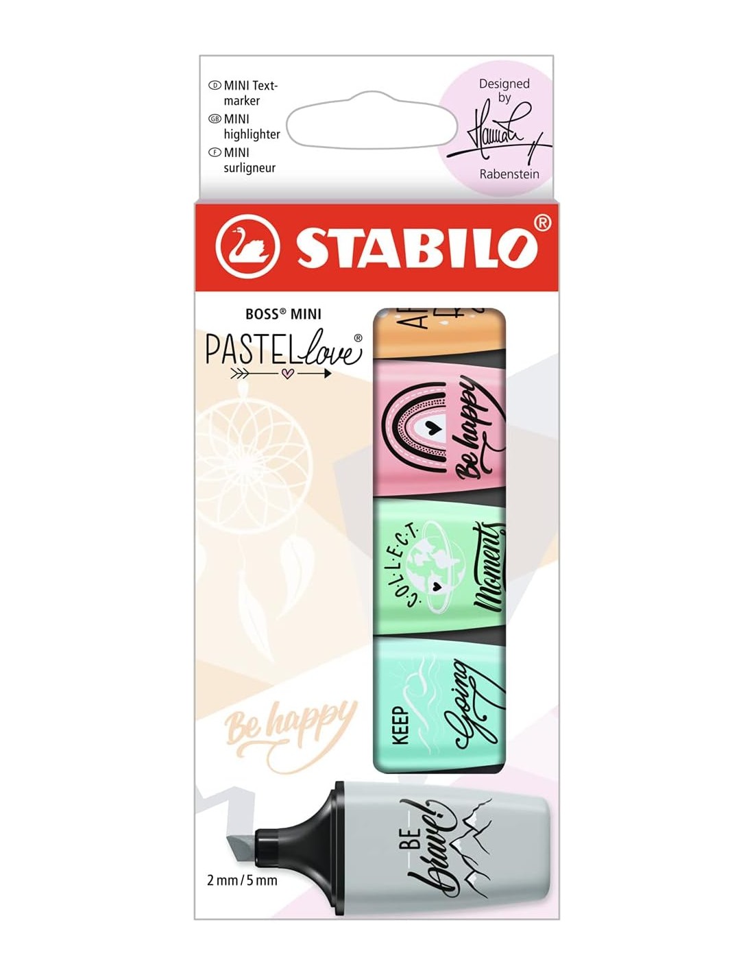Marque texto y resalte información importante con el marcador STABILO BOSS Mini Pastellove Edition en tonos pastel, con tecnología Anti-Dry-Out. Divertidos diseños para este marcador STABILO BOSS Mini Pastellove Edition con tecnología Anti-Dry-Out, de forma que pueda dejarlo destapado hasta cuatro horas sin que se seque. Adecuados para su uso en prácticamente todos los tipos de papel, estos marcadores incorporan puntas biseladas y pueden utilizarse para una amplia variedad de tareas, como escritura, subrayado o resaltado. Los marcadores de STABILO en tonos pastel son ideales para estudiantes y profesionales que tienen que leer y marcar información esencial en textos. Cada marcador presenta un cuerpo plano que impide que ruede. Esta colección incluye una variedad de seis colores pastel. Características: -Punta Biselada. -2 anchos de trazo 2 y 5 mm. -Tinta con base acuosa. -Tecnología Antisecado STABILO: 4 horas de protección antisecado para concentrarse en el trabajo. Especificaciones: -Pack de 5 uds. -Colores: Rosa, Naranja, Verde, Gris, y Turquesa