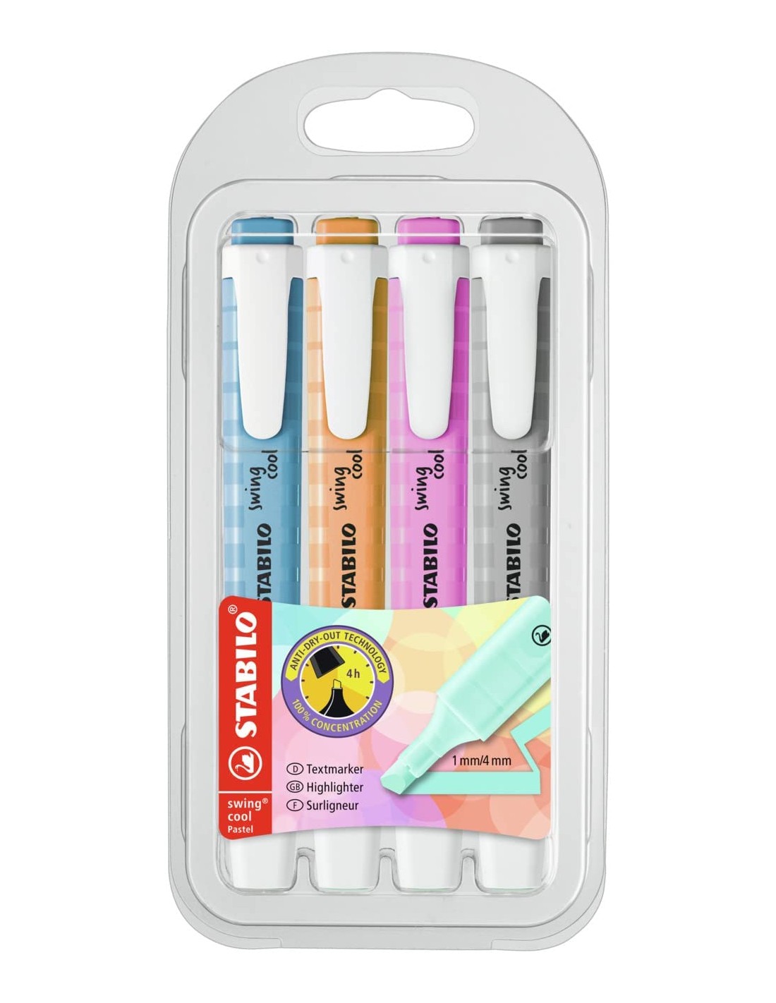 Stabilo Swing Cool Pastel Pack de 4 Marcadores Fluorescentes - Cuerpo Plano - Punta Biselada - Trazo entre 1 y 4mm - Tinta