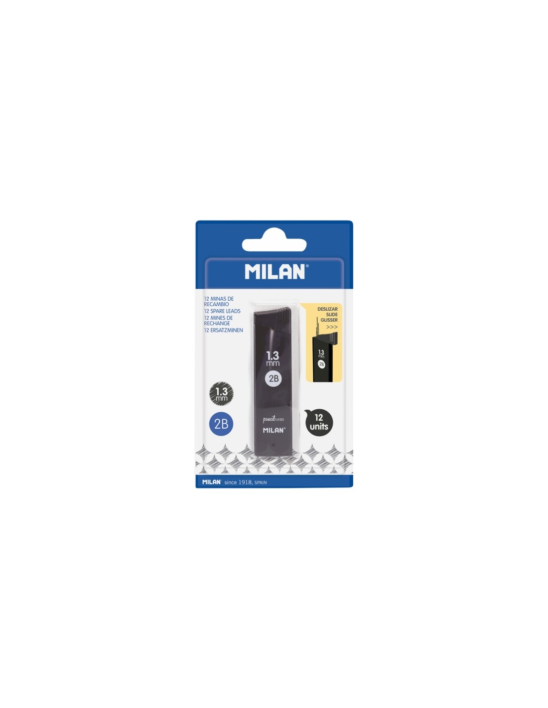 Bl ster con una caja que contiene 12 minas de grafito de 1.3mm de di metro marca Milan. Caracter sticas: -Bl ster con caja -12 minas de grafito -Di metro: 1.3mm -Dureza: 2B -Gruesas y suaves -Trazo similar a l piz de madera -Uso: dibujo y escritura -Compatibles con portaminas Eraser Pencil CAPSULE Fluo 1.3mm
