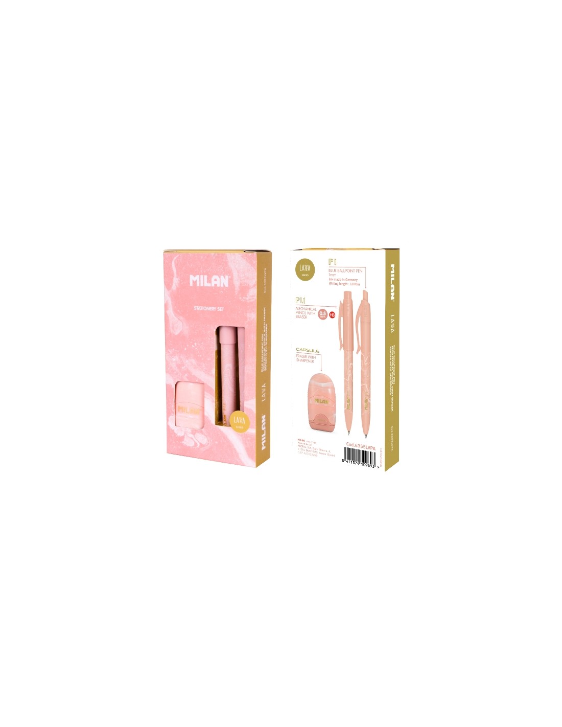 Set de regalo de la serie Lava de Milan que incluye un bol grafo, un portaminas, un afilaborra y accesorios, combinando funcionalidad y dise o inspirado en las erupciones volc nicas. Caracteristicas: -Caja regalo serie Lava de Milan -Color rosa -Inspiraci n: erupciones volc nicas y movimiento de roca fundida -Funcionalidad y dise o -Uso: detalle especial -Incluye bol grafo P1 -Tinta azul -Longitud: 14.1cm -Di metro: 1.7cm -Incluye portaminas PL1 -Punta: 0.5mm HB -Mecanismo rotatorio -Goma MILAN extra-larga -Medidas: 14.4 x 1.5 x 1.1cm -Incluye afilaborra CAPSULE -Dep sito y cuchilla de seguridad -Medidas: 6.5 x 3.5 x 2.4cm -Dise o original, desarrollado por I D Milan -Complementos: gomas y minas de recambio -Opci n ideal para regalar