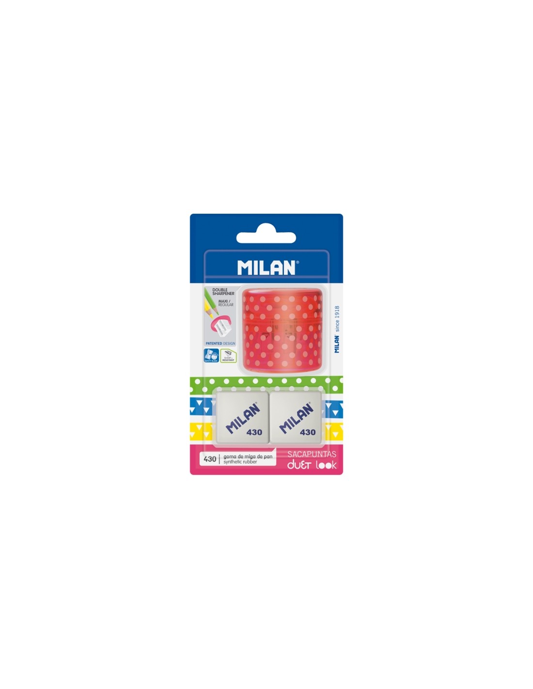 El producto es un bl ster que contiene un sacapuntas doble de la serie Look, modelo DUET, en color rosa, junto con dos gomas de borrar 430 de la marca Milan. Caracter sticas: -Bl ster con: -Sacapuntas doble serie Look, modelo DUET -Color rosa -Dos gomas de borrar 430 (Milan) -Sacapuntas: -Agujeros: est ndar y MAXI -Dep sito para residuos -Cuchilla de acero al carbono, afilada y resistente -Dise ado para todo tipo de l pices -Cuchilla de seguridad, fija al cuerpo -Dise o original de I D Milan -Gomas de borrar 430: -Caucho sint tico, miga de pan -Suaves y eficaces -Colores: blanco y rosa