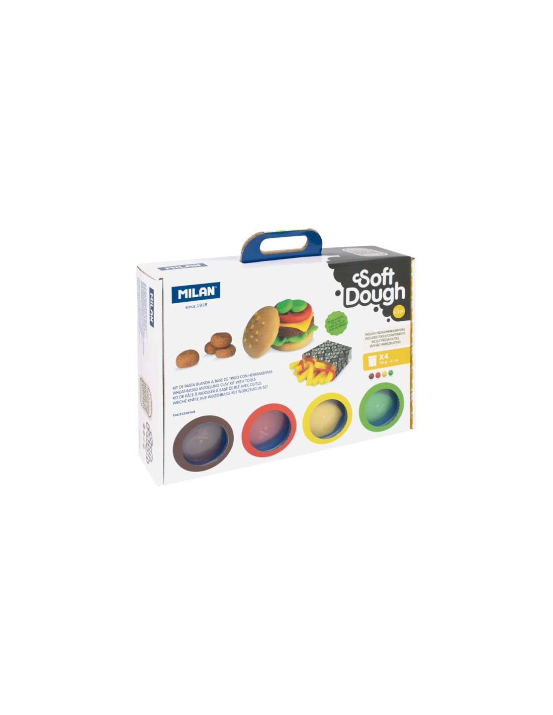 Kit de 4 botes de pasta blanda Soft Dough con herramientas y moldes tem ticos de hamburguesas de la marca Milan. Caracter sticas: -Malet n con 4 botes de pasta blanda (116 g c/u) -Tem tica: Casa de las Hamburguesas -Consistencia blanda y el stica -F cil de modelar y reutilizable -Permite mezclar colores para nuevos tonos -Sin residuos en manos -Beneficios: -Fomenta creatividad -Desarrolla habilidades motrices finas -Estimula imaginaci n -Ingredientes de origen vegetal -Contiene gluten Incluye: -4 botes de colores (amarillo, rojo, verde, marr n) -12 herramientas y moldes