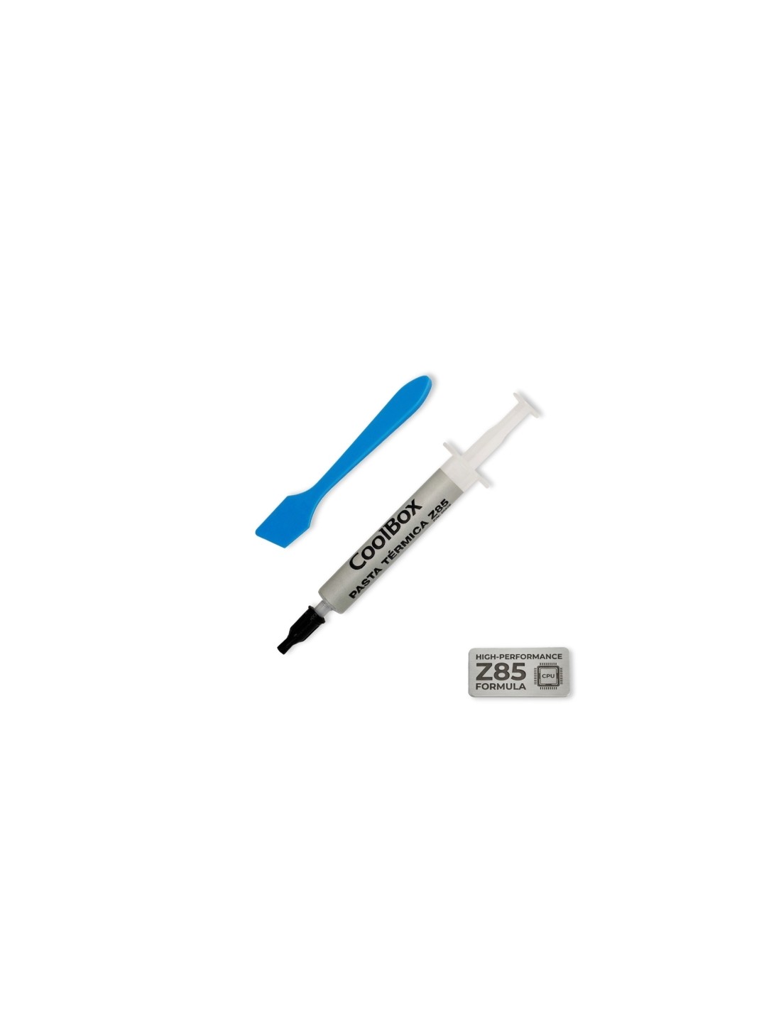 La pasta t rmica de CoolBox Z85 es un compuesto el ctricamente no conductor y de baja resistencia t rmica, formulado con un alto contenido de xidos met licos. Garantiza una excelente transferencia de calor entre componentes como CPU, memorias y chipsets gr ficos hacia el sistema de refrigeraci n, mejorando la disipaci n t rmica y el rendimiento del equipo. Especificaciones -Color: Gris -Conductividad t rmica: 8.5W/m-K -Resistencia t rmica: 0.028 ºC-in2/W -Temperatura de funcionamiento: -30 ºC 150 ºC -Capacidad: 2g