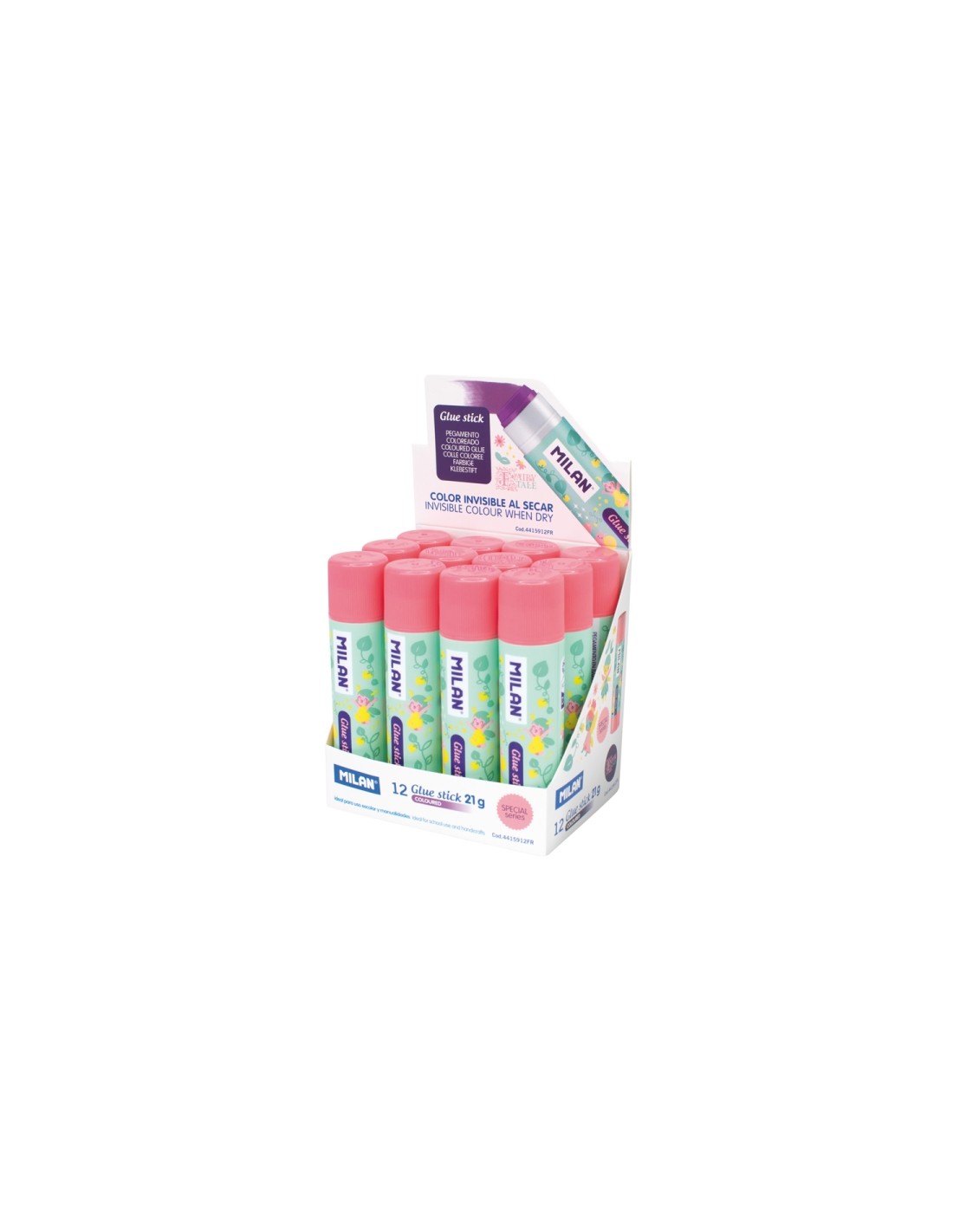 Milan Fairy Tale Expositor con 12 Barras de Pegamento 21g - Multiusos - Multisuperficies - Sin Disolventes - Uso Escolar -