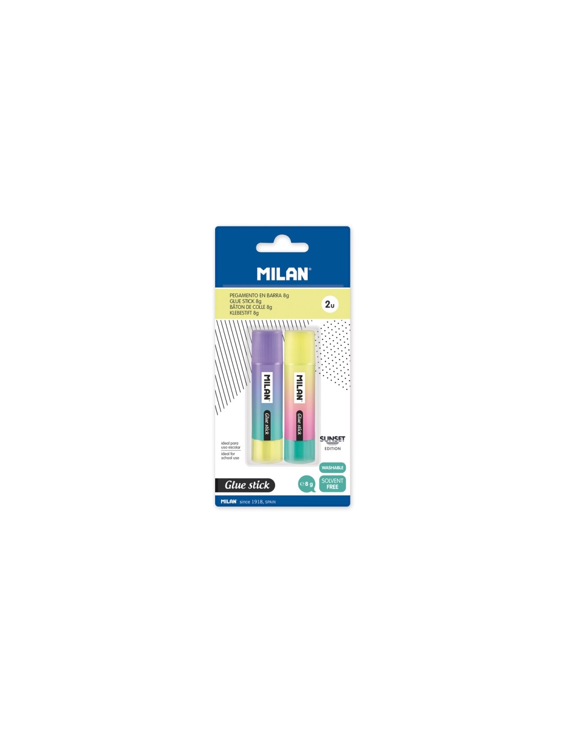 Bl ster con 2 barras de pegamento en formato de 8 g cada una de la serie Sunset de Milan. Caracter sticas: -Bl ster con 2 barras de pegamento -Cada barra: 8 g -Serie: Sunset -Formato: barras en formato de 8 g -Tama o compacto: -Di metro: 2cm -Longitud: 8.3cm -Uso m ºltiple: -Papel -Cartulinas -Fotos -Tejidos -Fieltro -Corcho -Cuero -Espuma -Sin disolventes -Seguro y apto para uso escolar -Colores: lila y amarillo